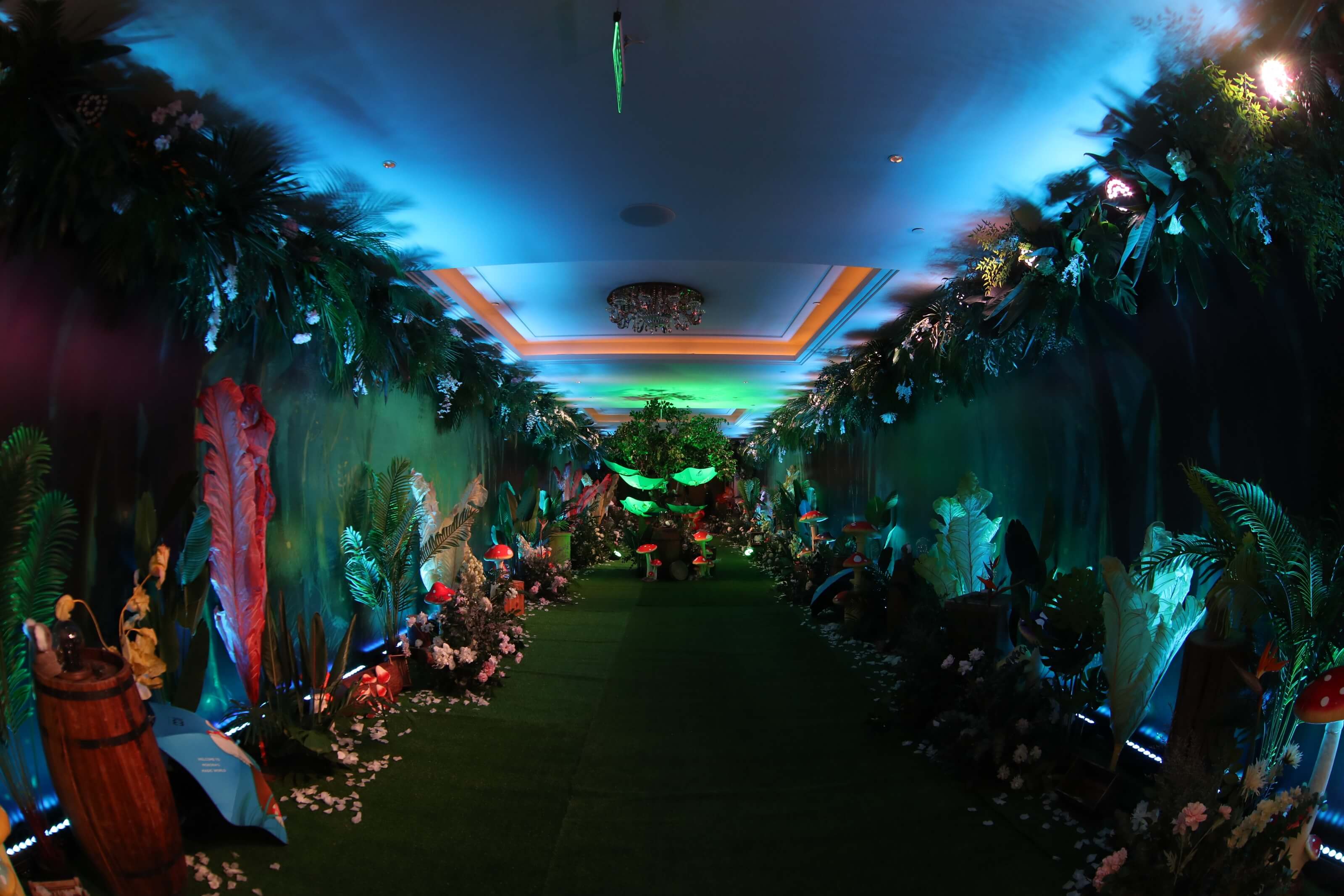 本次盛会的现场布置,创意来源于魔考啦品牌故事,精心打造了一个极富原始森林氛围的自然场景,发布会现场萦绕着巨大的魔幻蘑菇,奇幻的树林,托玛琳宝石,魔考啦精灵……