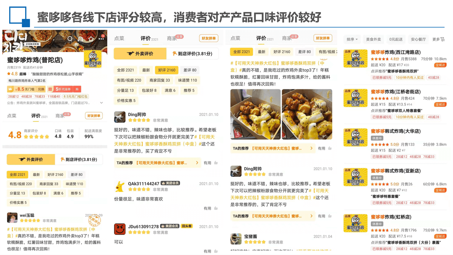 蜜哆哆炸鸡创始于2014年,总部位于上海。从诞生以来,一直专注于韩式口味炸鸡的研发,因此口味上保持了正宗的韩国风味。外卖为其主要营销途径,是饿了么,美团外卖口碑比较好的品牌,日均销售额突破50000单,拥有90%的回头率,外卖界遥遥领先的黑马。