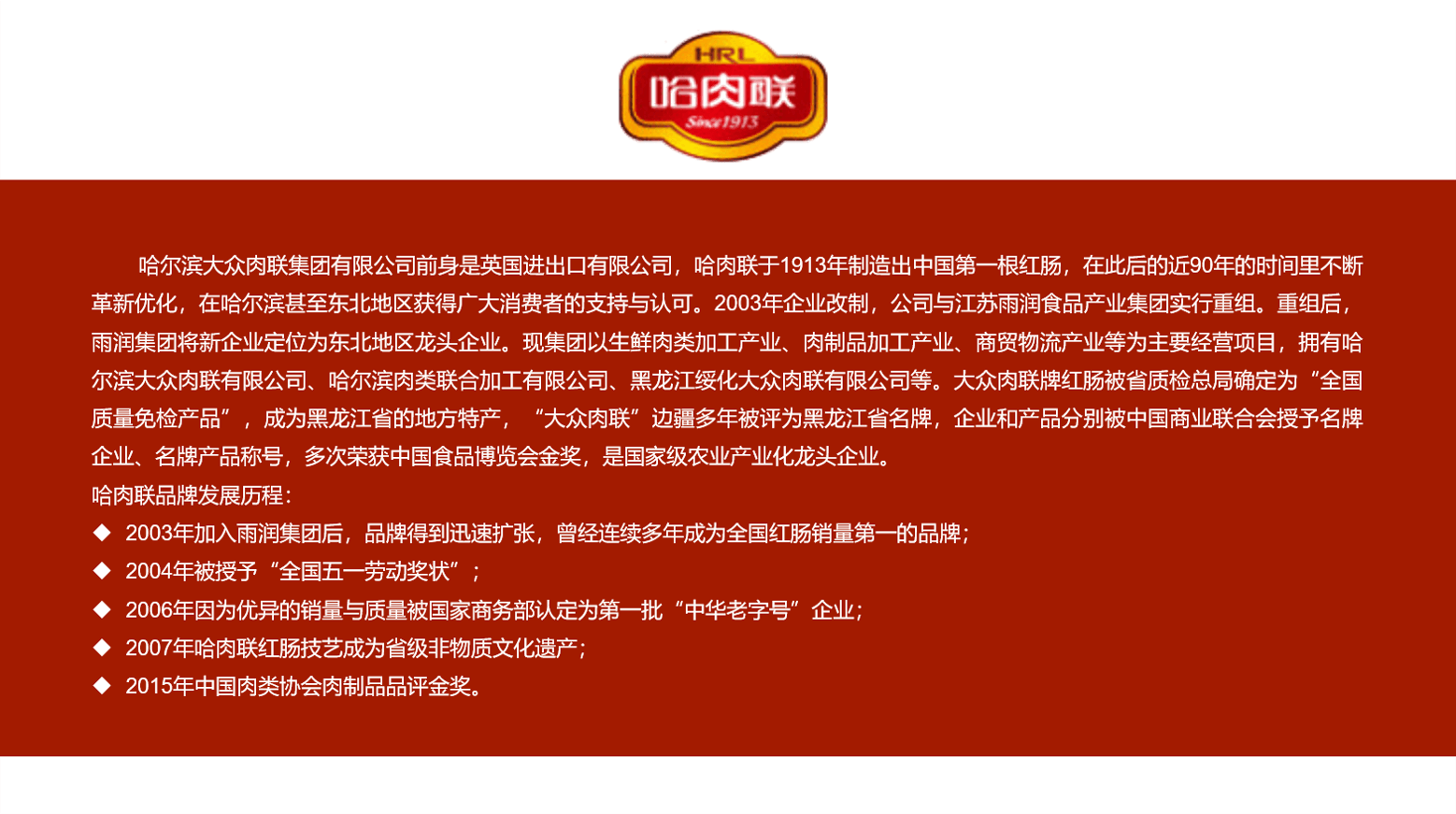 哈尔滨大众肉联集团有限公司前身是英国进出口有限公司,哈肉联于1913年制造出中国第一根红肠,在此后的近90年的时间里不断革新优化,在哈尔滨甚至东北地区获得广大消费者的支持与认可。2003年企业改制,公司与江苏雨润食品产业集团实行重组。重组后,雨润集团将新企业定位为东北地区龙头企业。现集团以生鲜肉类加工产业、肉制品加工产业、商贸物流产业等为主要经营项目,拥有哈尔滨大众肉联有限公司、哈尔滨肉类联合加工有限公司、黑龙江绥化大众肉联有限公司等。大众肉联牌红肠被省质检总局确定为“全国质量免检产品”,成为黑龙江省的地方特产,“大众肉联”边疆多年被评为黑龙江省名牌,企业和产品分别被中国商业联合会授予名牌企业、名牌产品称号,多次荣获中国食品博览会金奖,是国家级农业产业化龙头企业。