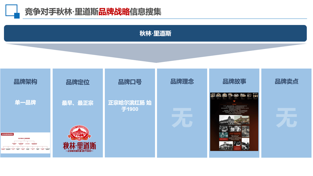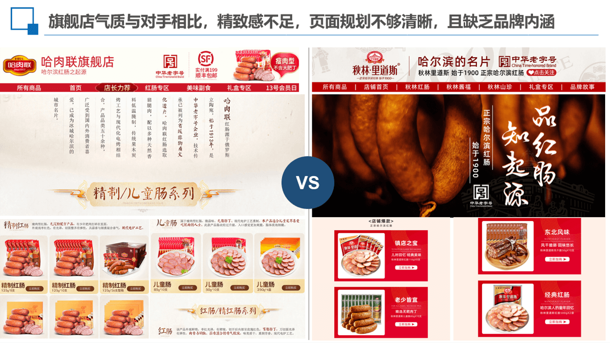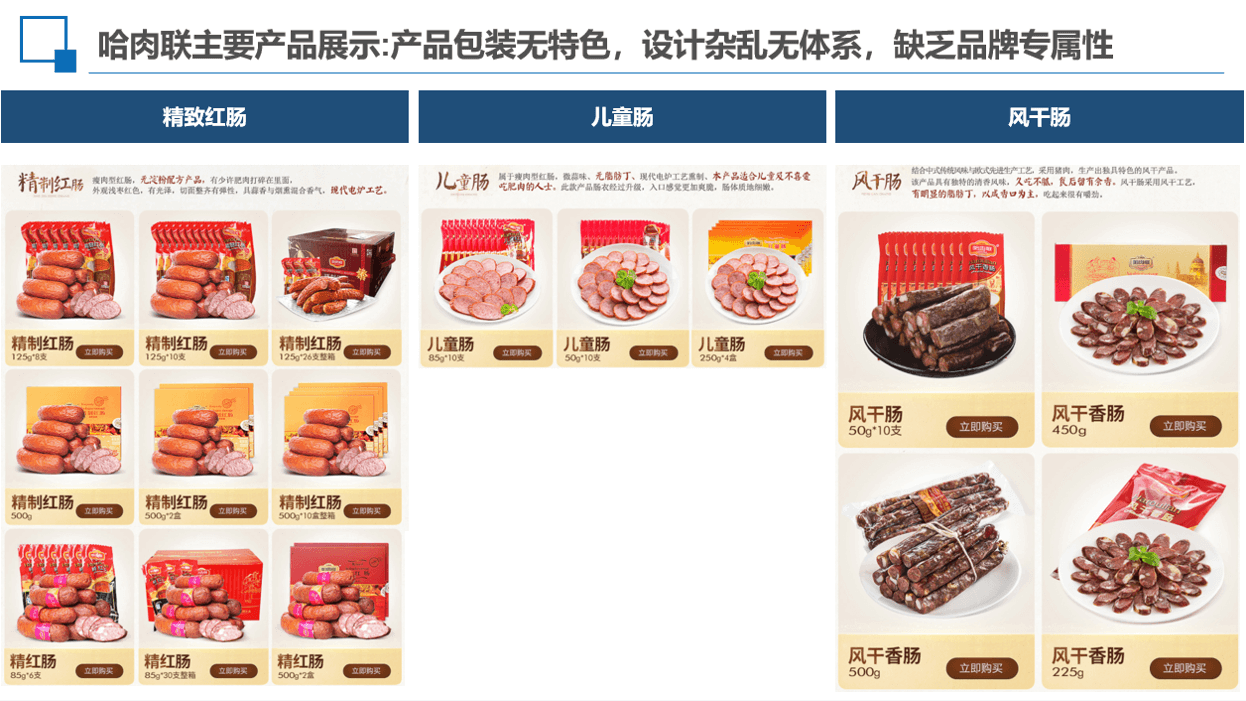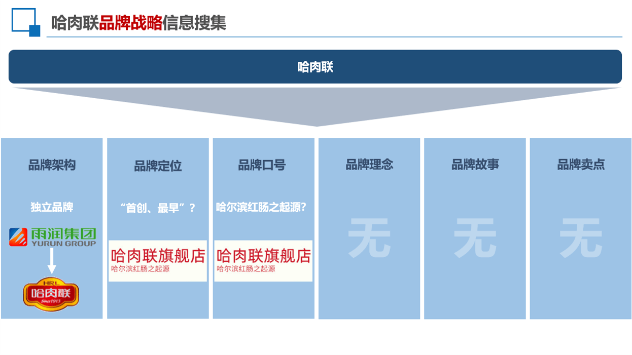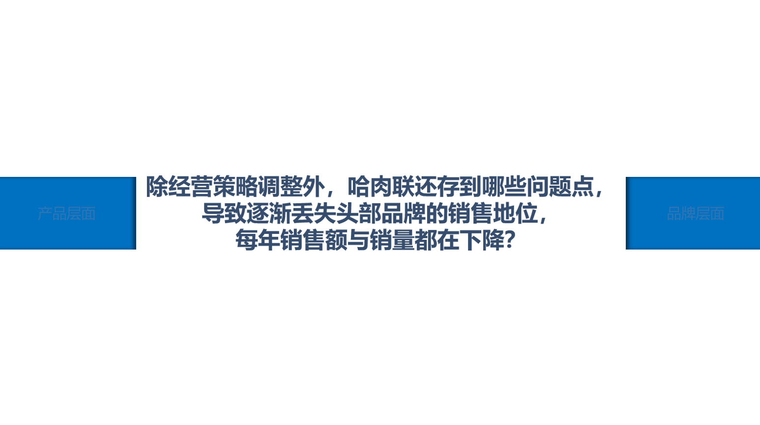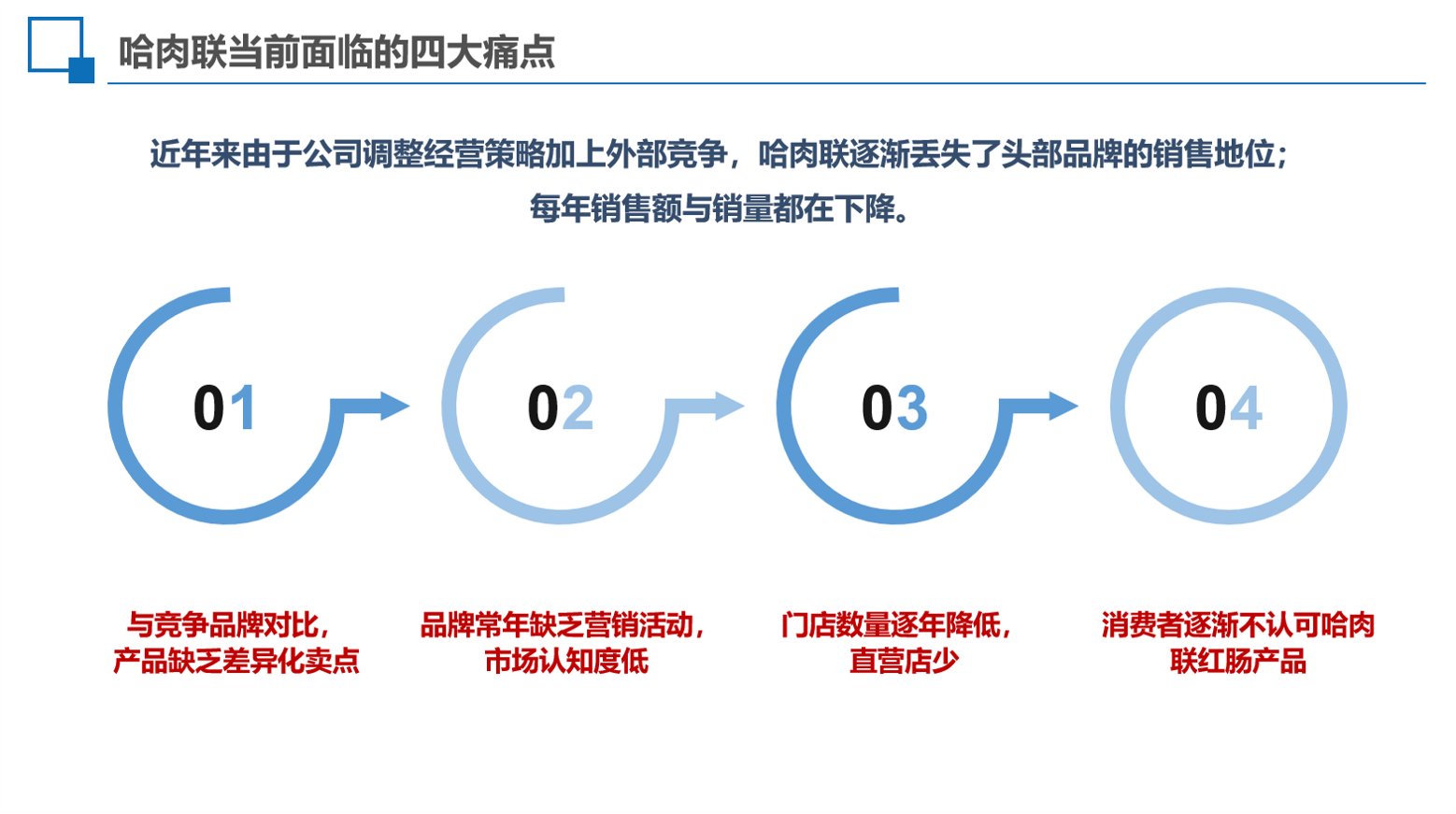2021年1月14日,哈尔滨百年品牌哈肉联与行舟品牌进行了合作会谈。哈肉联作为一个百年老品牌,近年来由于公司调整经营策略加上外部竞争,哈肉联逐渐丢失了头部品牌的销售地位。当下品牌面临四大痛点,第一,缺乏差异化卖点;第二,缺乏营销推广,市场认知度低;第三,门店数量逐年减少;第四,消费者认知出现断层。因此,本次行舟主要针对品牌方面临的一些问题点进行深度分析与建议。