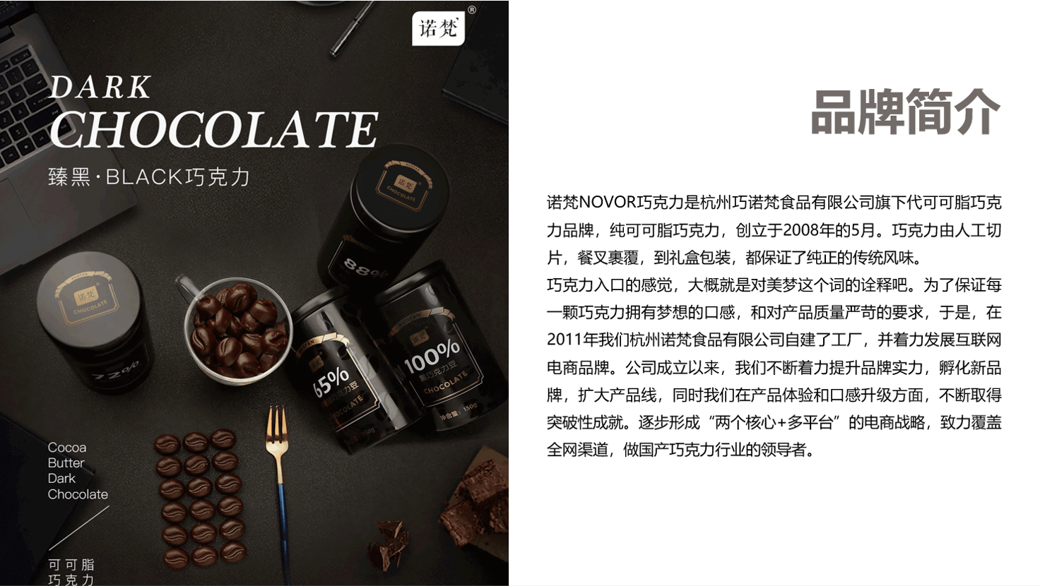 巧克力入口的感觉,大概就是对美梦这个词的诠释吧。为了保证每一颗巧克力拥有梦想的口感,和对产品质量严苛的要求,于是,在2011年我们杭州诺梵食品有限公司自建了工厂,并着力发展互联网电商品牌。公司成立以来,我们不断着力提升品牌实力,孵化新品牌,扩大产品线,同时我们在产品体验和口感升级方面,不断取得突破性成就。逐步形成“两个核心+多平台”的电商战略,致力覆盖全网渠道,做国产巧克力行业的领导者。