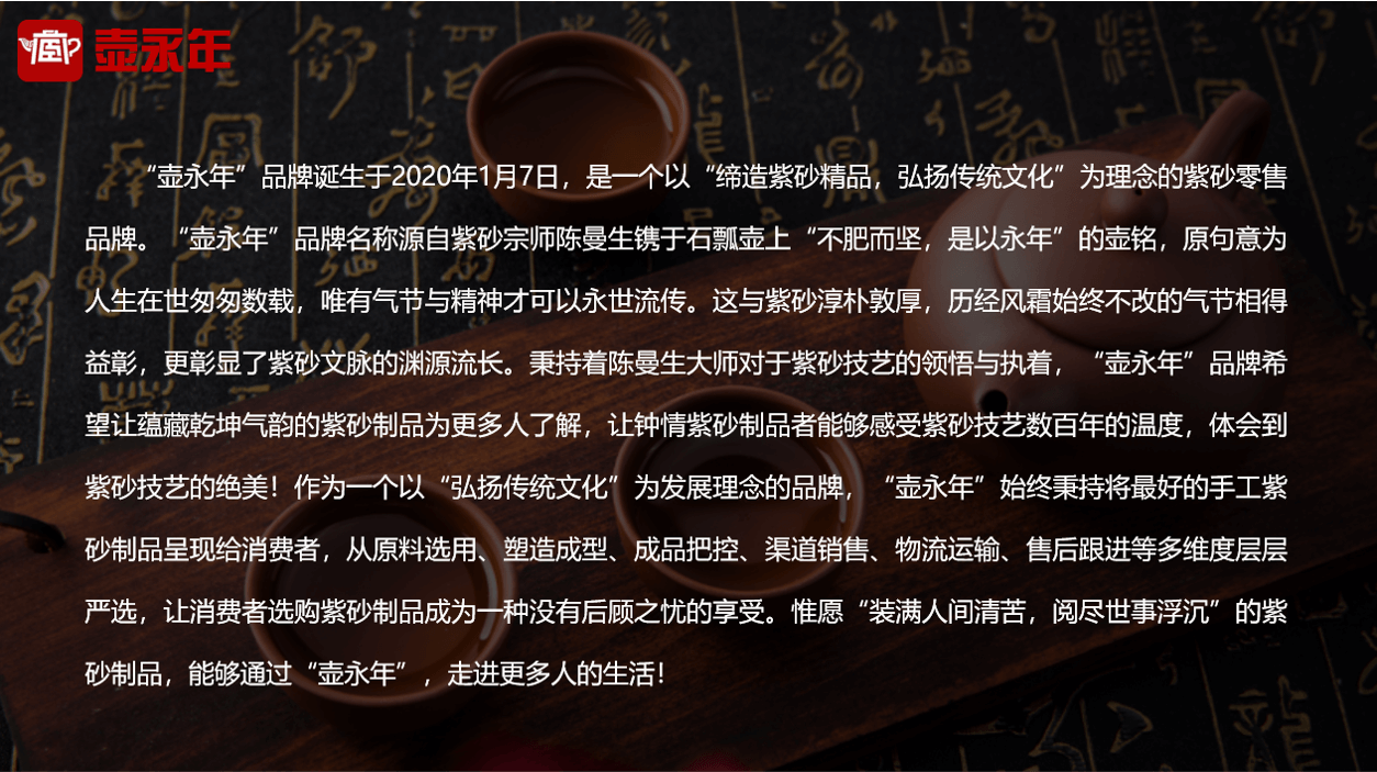 壶永年品牌诞生于2020年1月7日,是一个以“缔造紫砂精品,弘扬传统文化”为理念的紫砂零售品牌。“壶永年”品牌名称源自紫砂宗师陈曼生镌于石瓢壶上“不肥而坚,是以永年”的壶铭,原句意为人生在世匆匆数载,唯有气节与精神才可以永世流传。这与紫砂淳朴敦厚,历经风霜始终不改的气节相得益彰,更彰显了紫砂文脉的渊源流长。秉持着陈曼生大师对于紫砂技艺的领悟与执着,“壶永年”品牌希望让蕴藏乾坤气韵的紫砂制品为更多人了解,让钟情紫砂制品者能够感受紫砂技艺数百年的温度,体会到紫砂技艺的绝美!作为一个以“弘扬传统文化”为发展理念的品牌,“壶永年”始终秉持将最好的手工紫砂制品呈现给消费者,从原料选用、塑造成型、成品把控、渠道销售、物流运输、售后跟进等多维度层层严选,让消费者选购紫砂制品成为一种没有后顾之忧的享受。惟愿“装满人间清苦,阅尽世事浮沉”的紫砂制品,能够通过“壶永年”,走进更多人的生活!