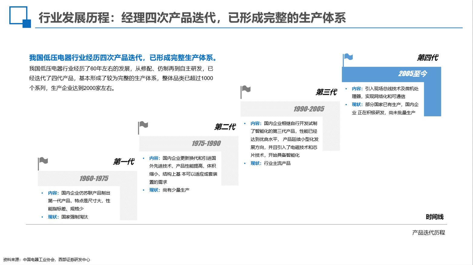 随着经济持续发展及人民生活水平的不断提高,需求端对低压电器的要求将越来越高,低端市场正在萎缩,缺乏研发能力的小企业也逐渐消亡或者被收购。在供给端,一方面国内部分原先面向S3市场的厂商已研发出中高端产品,行业呈现出S3加速向S2渗透的趋势,另一方面原先以S2市场为主的中高端国内龙头企业,技术研发实力不断积累,产品安全性和可靠性不断提高,在产品线和市场布局方面主动向S1市场上移。预计未来国内低压电器中高端和中端市场有望不断扩大,行业结构将向纺锤体形状发展。