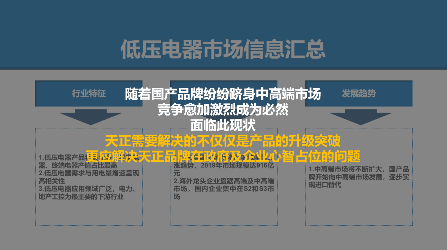随着国产品牌纷纷跻身中高端市场,竞争愈加激烈成为必然,面临此现状,天正当前需要解决的不仅仅是产品的升级突破,更应解决天正品牌在政府及企业心智占位的问题,因此找到行舟,希望借助外脑的力量,全面对品牌进行升级。行舟品牌对天正的情况做了初步的梳理,并提出了有针对性的解决方案,得到天正电气领导的认可,项目目前正在有序推进中。