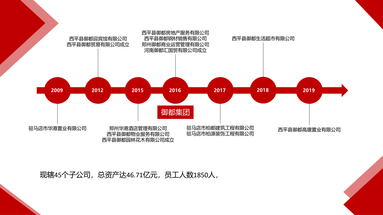 2009年御都集团第一个子公司驻马店市华港置业有限公司成立,直至2016年进行产业组合,成立御都集团,现辖17个子公司:驻马店市华港置业有限公司、西平县御都置业有限公司、西平县御都物业服务有限公司、西平县御都贸易有限公司、西平御都迎宾馆有限公司、西平县御都商务服务有限公司、西平县御都园林花木有限公司、河南御都汇国贸有限公司、郑州御都商业运营管理有限公司、西平县御都房地产服务有限公司、郑州华港酒店管理有限公司、西平县御都钢材销售有限公司、驻马店市柏源装饰工程有限公司、驻马店市柏都建筑工程有限公司、西平县御都生活超市有限公司,现有总资产46.71亿元,员工1818人,年利税8亿元人民币。