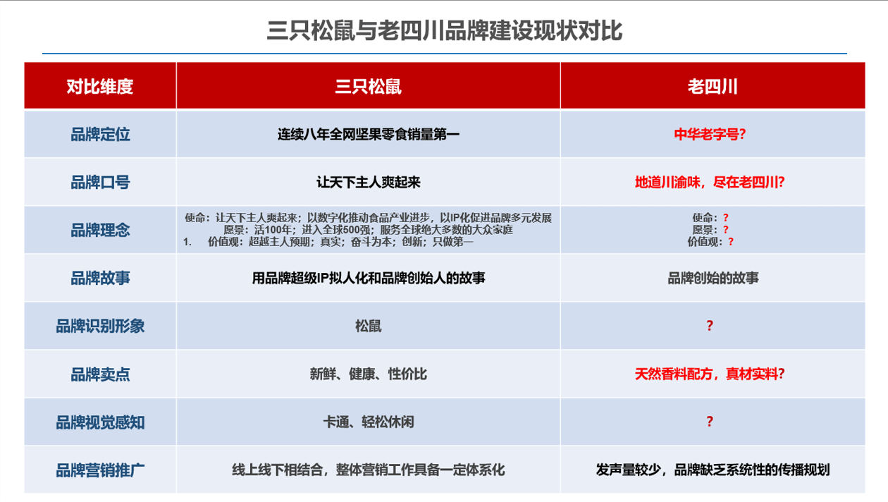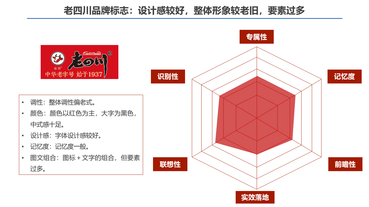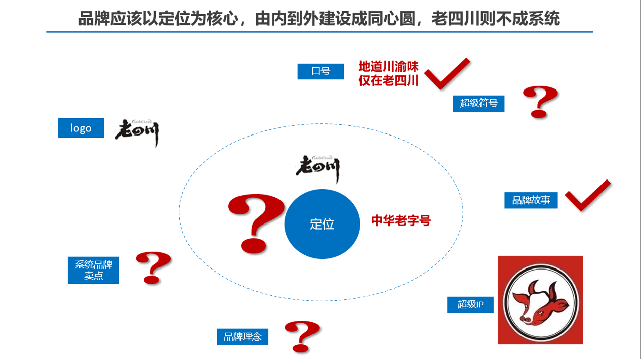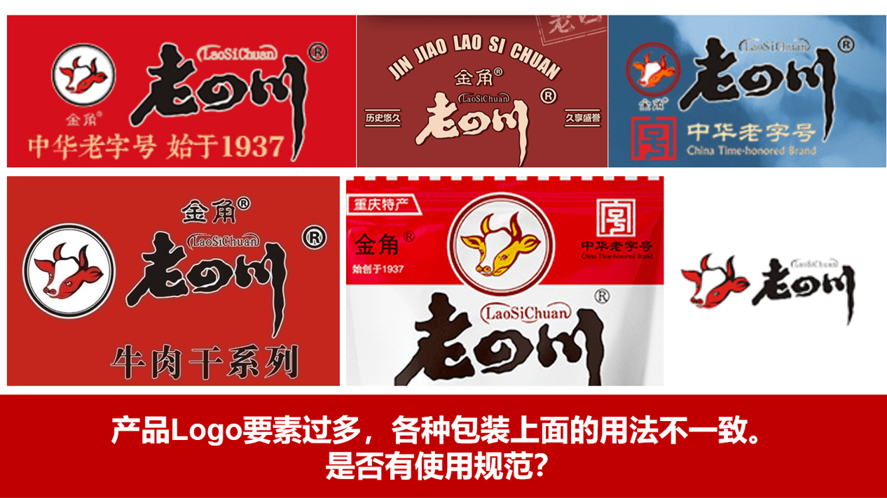 在与老四川品牌沟通初期,行舟发现老四川品牌存在诸多问题,因此为品牌做了系统的诊断。经过老四川对外露出的信息以及企业内部资料的收集,初步判断品牌在战略层面至少10大问题点:1、“中华老字号”的品牌的定位存在问题,没有从企业自身、竞品品牌与消费者三者角度进行考量;2、品牌的口号缺乏核心要素,需进一步验证;3、品牌的卖点缺失,产品卖点太过泛化;4、品牌的故事与消费者之间难以形成强烈的共鸣感;5、品牌理念体系缺失;6、品牌同心圆体系未健全;7、品牌标志对外使用不规范,且气质老旧,年轻化缺失;8、品牌包装体系化缺失,视觉较为杂乱,系列感与品牌感不足;9、整体视觉关联度较低,缺乏超级记忆点;10、营销传播渠道较窄,声量较小,缺乏系统规划,散点发力,难以形成势能。