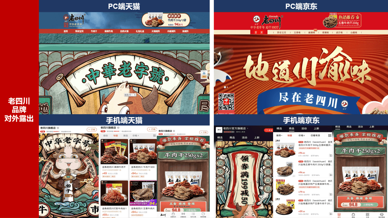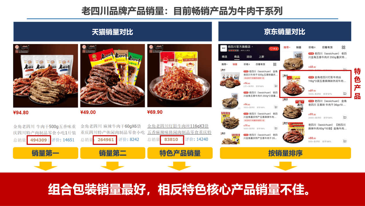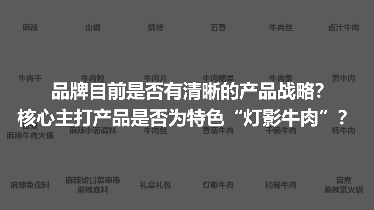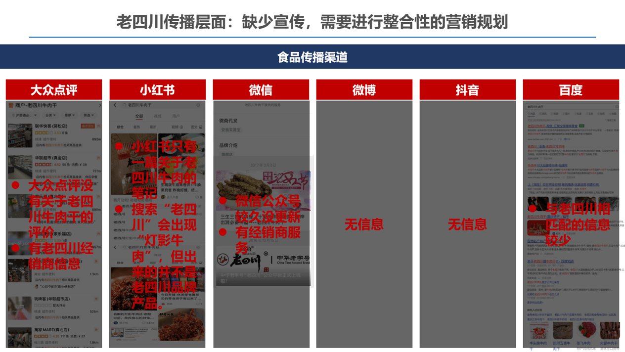 在与老四川品牌沟通初期,行舟发现老四川品牌存在诸多问题,因此为品牌做了系统的诊断。经过老四川对外露出的信息以及企业内部资料的收集,初步判断品牌在战略层面至少10大问题点:1、“中华老字号”的品牌的定位存在问题,没有从企业自身、竞品品牌与消费者三者角度进行考量;2、品牌的口号缺乏核心要素,需进一步验证;3、品牌的卖点缺失,产品卖点太过泛化;4、品牌的故事与消费者之间难以形成强烈的共鸣感;5、品牌理念体系缺失;6、品牌同心圆体系未健全;7、品牌标志对外使用不规范,且气质老旧,年轻化缺失;8、品牌包装体系化缺失,视觉较为杂乱,系列感与品牌感不足;9、整体视觉关联度较低,缺乏超级记忆点;10、营销传播渠道较窄,声量较小,缺乏系统规划,散点发力,难以形成势能。