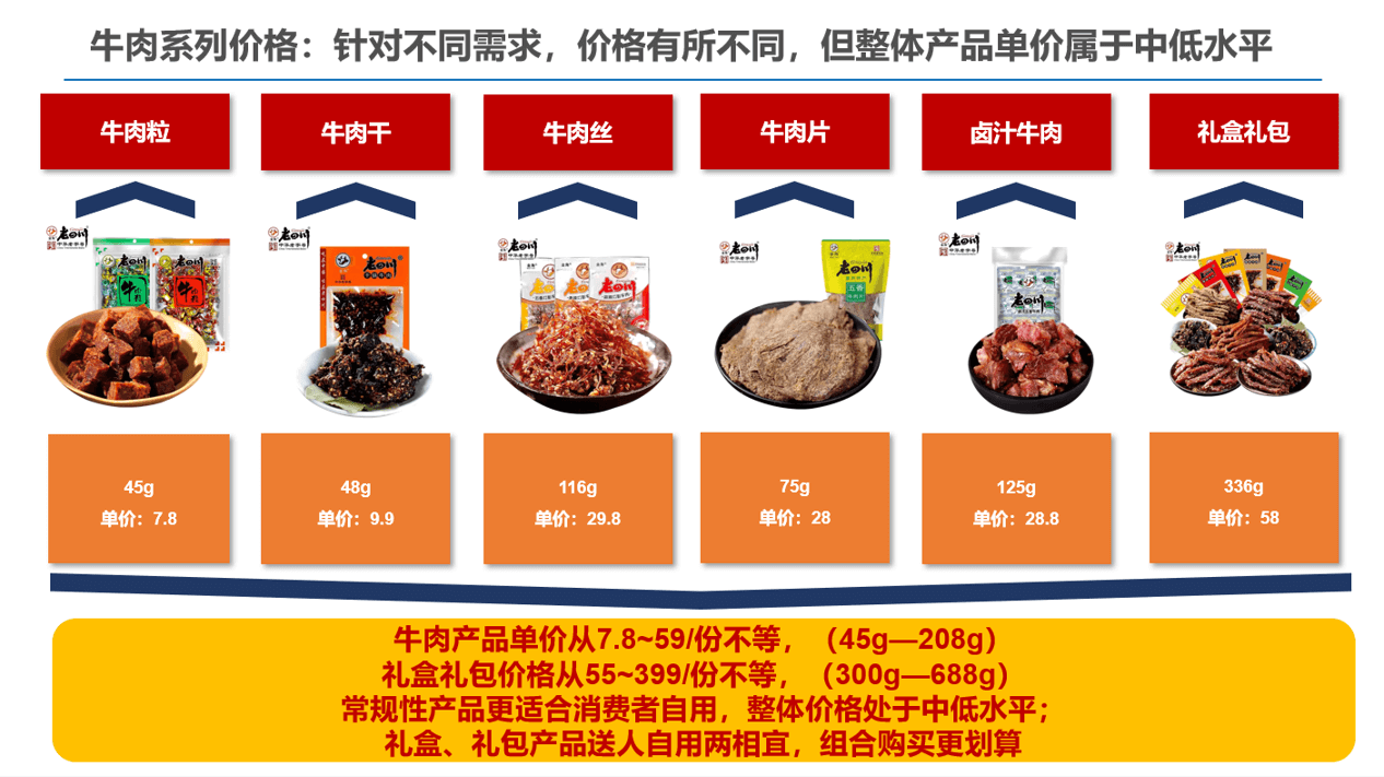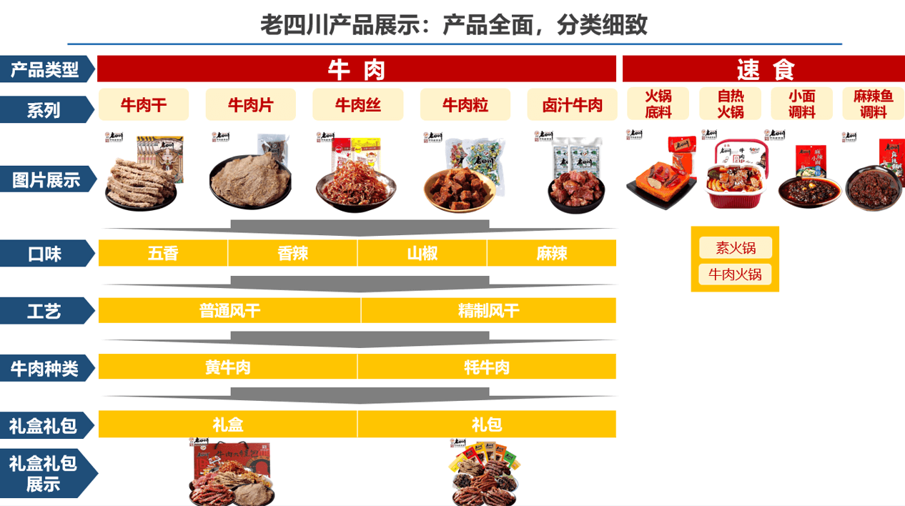 “金角·老四川”牛肉干系列产品采用鲜牛肉为主料,配以多种名贵天然香料,以传统工艺和现代技术相结合精制而成。产品肉丝绵实,营养丰富,风味独特,是居家旅行,佐酒助餐,馈赠亲友之上品。已开发的产品有五香牛肉干、麻辣牛肉干、精品牛肉干、果汁牛肉干、香辣牛肉干、灯影牛肉干、沙爹牛肉干等几大系列几十个品种,并投入巨资研究开发新品种以满足市场和消费者的不断需求。凭籍多年的成功发展,公司现已成为西部最大的牛肉干生产基地,其产销量、知名度、市场覆盖率等均列为全国同行业前列。公司拥有5个自己的养牛基地,2006年被重庆市人民政府确定为市级农业综合开发重点龙头企业,公司凭借实力,带领“牛农”不断致富,为社会主义新农村建设作出自己应有的贡献!