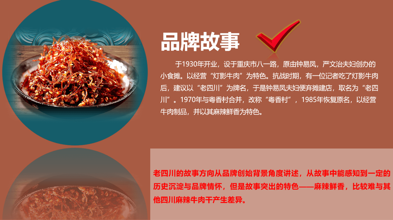 老四川品牌成立于1930年开业,设于重庆市八一路,原由钟易凤,严文治夫妇创办的小食摊。以经营“灯影牛肉”为特色。抗战时期,有一位记者吃了灯影牛肉后,建议以“老四川”为牌名,于是钟易凤夫妇便弃摊建店,取名为“老四川”。1970年与粤香村合并,改称“粤香村”,1985年恢复原名,以经营牛肉制品,并以其麻辣鲜香为特色。