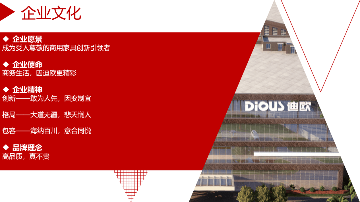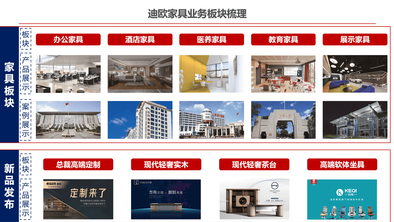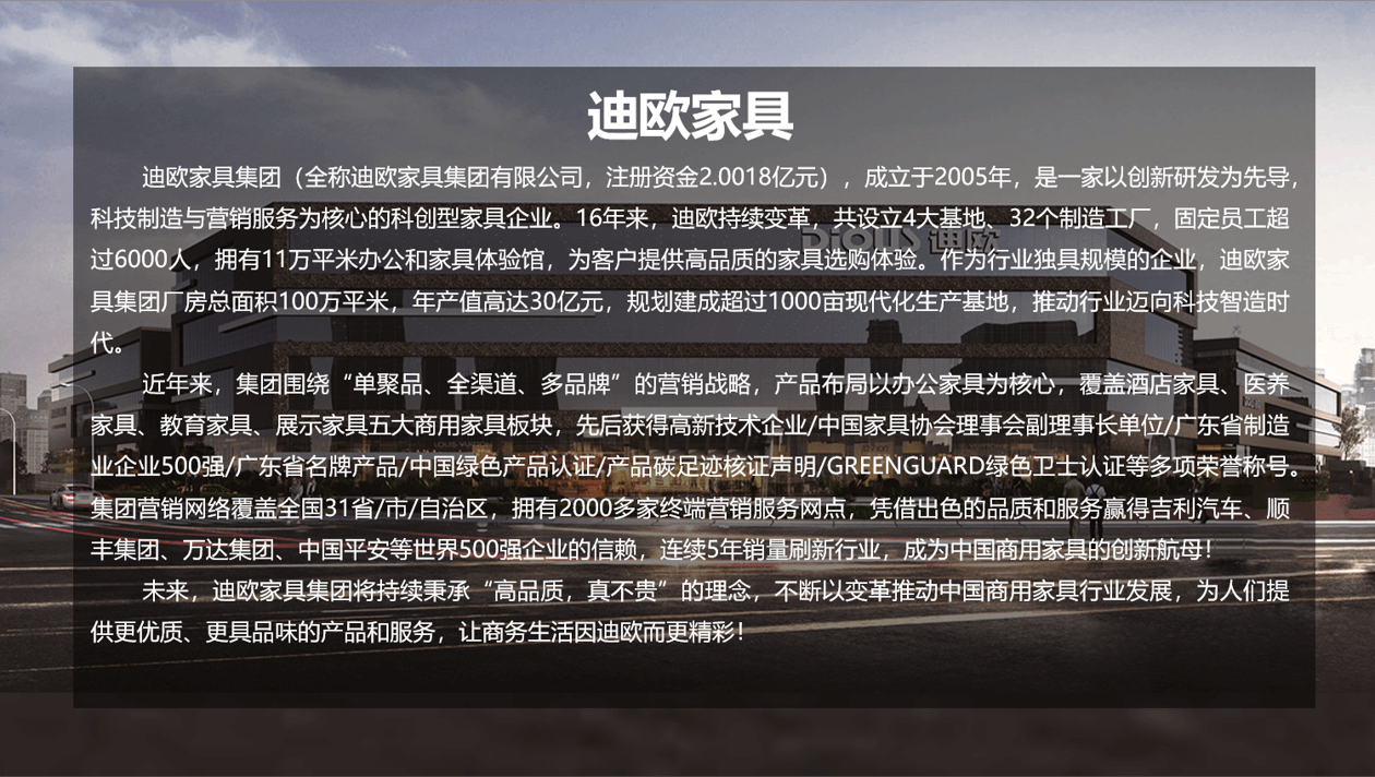 迪欧家具集团(全称迪欧家具集团有限公司,注册资金2.0018亿元),成立于2005年,是一家以创新研发为先导,科技制造与营销服务为核心的科创型家具企业。16年来,迪欧持续变革,共设立4大基地、32个制造工厂,固定员工超过6000人,拥有11万平米办公和家具体验馆,为客户提供高品质的家具选购体验。作为行业独具规模的企业,迪欧家具集团厂房总面积100万平米,年产值高达30亿元,规划建成超过1000亩现代化生产基地,推动行业迈向科技智造时代。