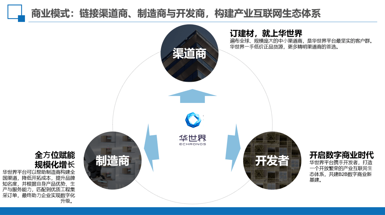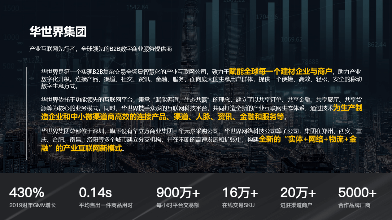 华世界是第一个实现B2B复杂交易全场景智慧化的产业互联网公司,致力于赋能全球每一个建材企业与商户,助力产业数字化升级。连接产品、渠道、社交、资讯、金融、服务,面向庞大的生意用户群体,提供一个便捷、高效、轻松、安全的移动数字生意方式。