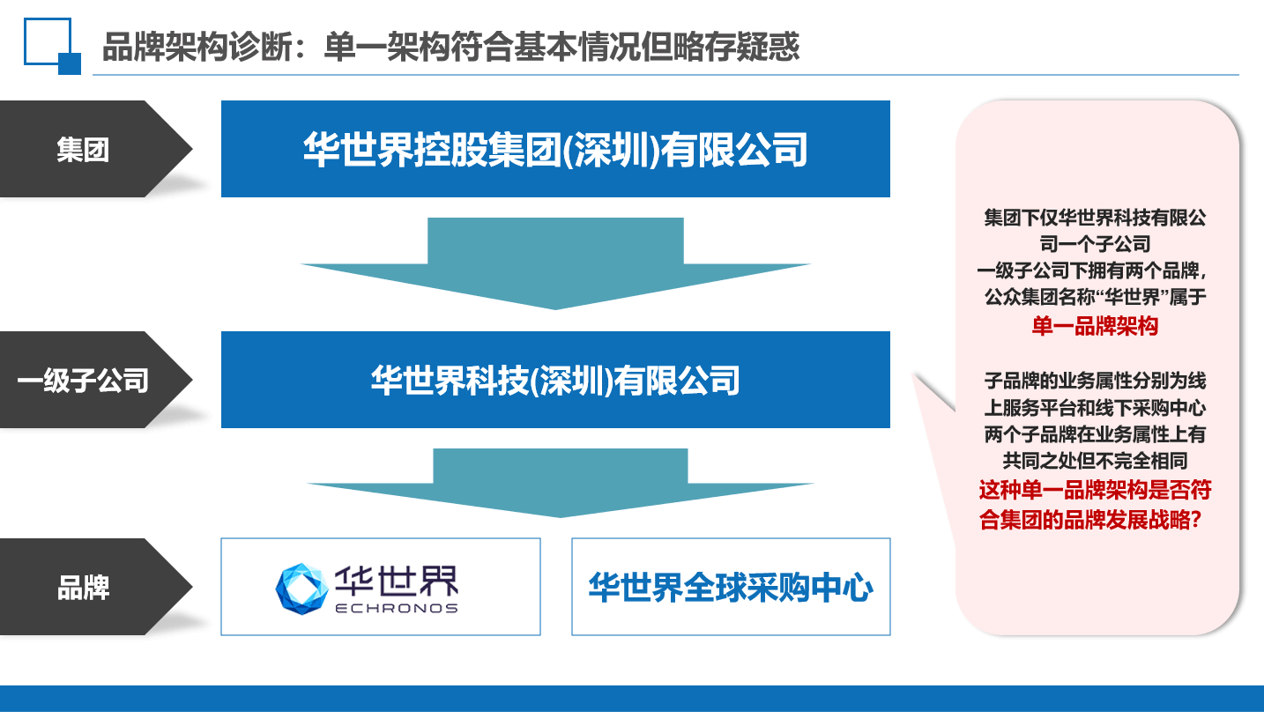 从业务模式及市场规模层面上来说,华世界目前在行业的位置处于领先地位。但品牌层面一直未系统进行梳理,因此在面向三方合作商时,无论是品牌的定位,亦或是品牌的相关描述,都很难精准表达。企业高层从长远可持续发展考虑,对品牌的建设工作愈发重视,本次找到行舟,希望通过专业的力量,助力品牌全面升级,精准找到企业的品牌定位。