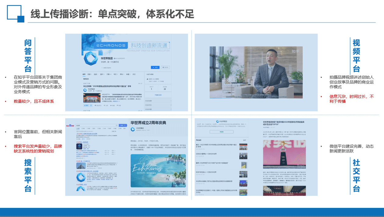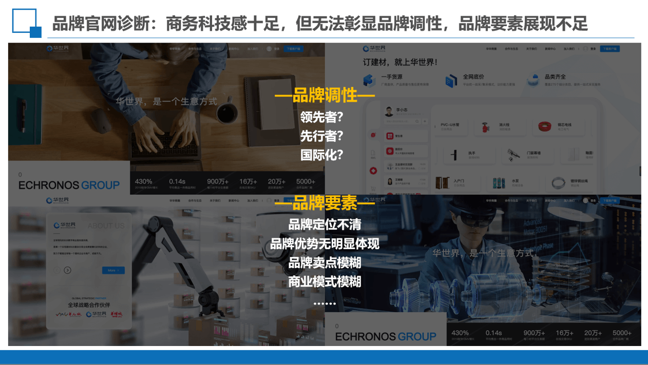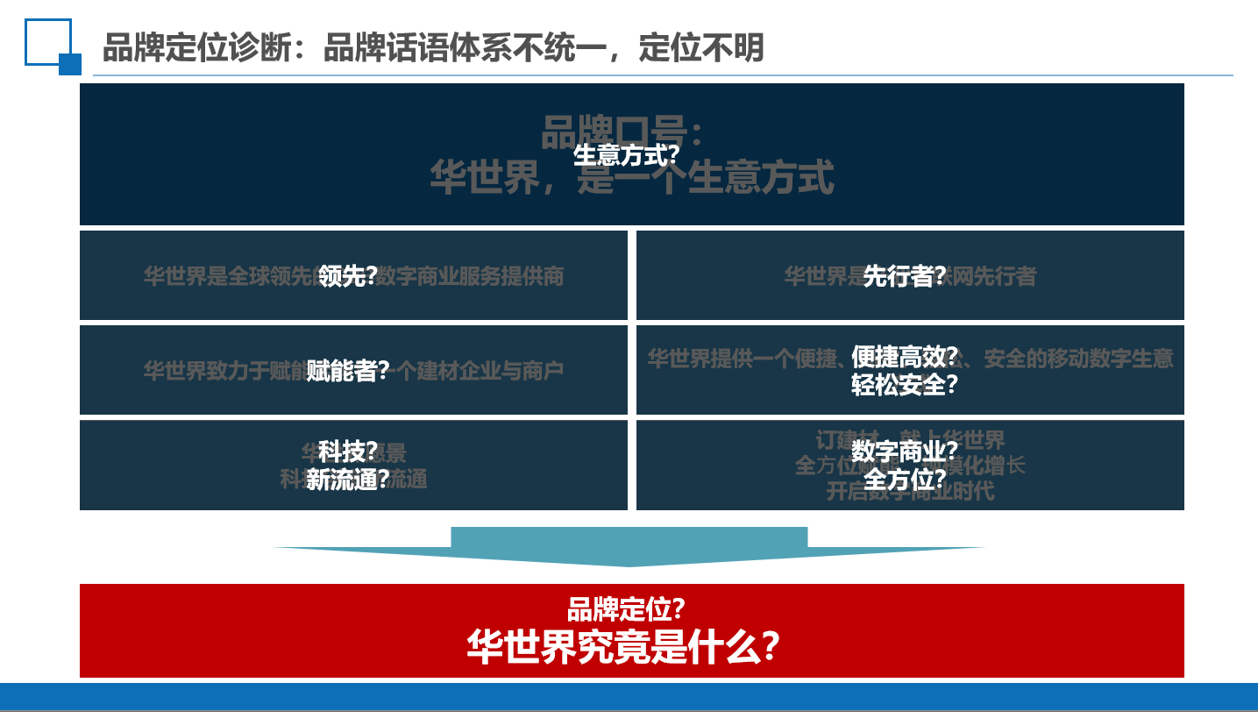解决问题的首要条件是发现问题。行舟品牌利用独创的大定位工具,开始对华世界品牌展开系统诊断。行舟通过华世界品牌的信息网站、资料咨讯、线上测评获取的信息,初步判断,华世界在品牌战略层面至少存在8大问题: