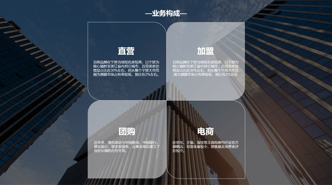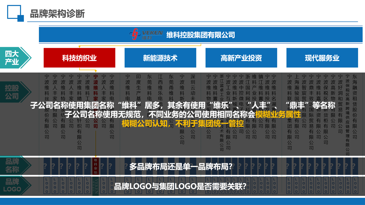 1、品牌架构:维科家纺与集团的关系应该是单一品牌,但旗下子公司名称使用集团名称“维科”居多,其余有使用“维乐”、“人丰”、“鼎丰”等名称,子公司名称使用无规范,不同业务的公司使用相同名称会模糊业务属性,模糊公司认知,不利于集团统一管控;