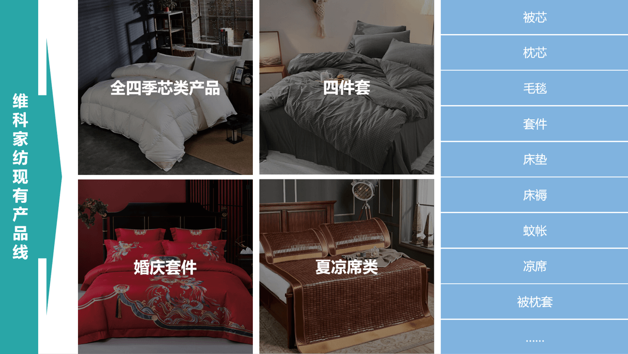 维科家纺成立于1998年,隶属于维科控股集团股份有限公司,前身为1905创办的“宁波和丰纱厂”。维科家纺依托集团强大的投资实力,公司优质的资源渠道,历经数年品牌运作,已在国内建立了完善的营销和售后服务网络,是国内集设计研发、生产制造、营销服务、物流配送为一体的具有强大综合实力的知名家纺企业。