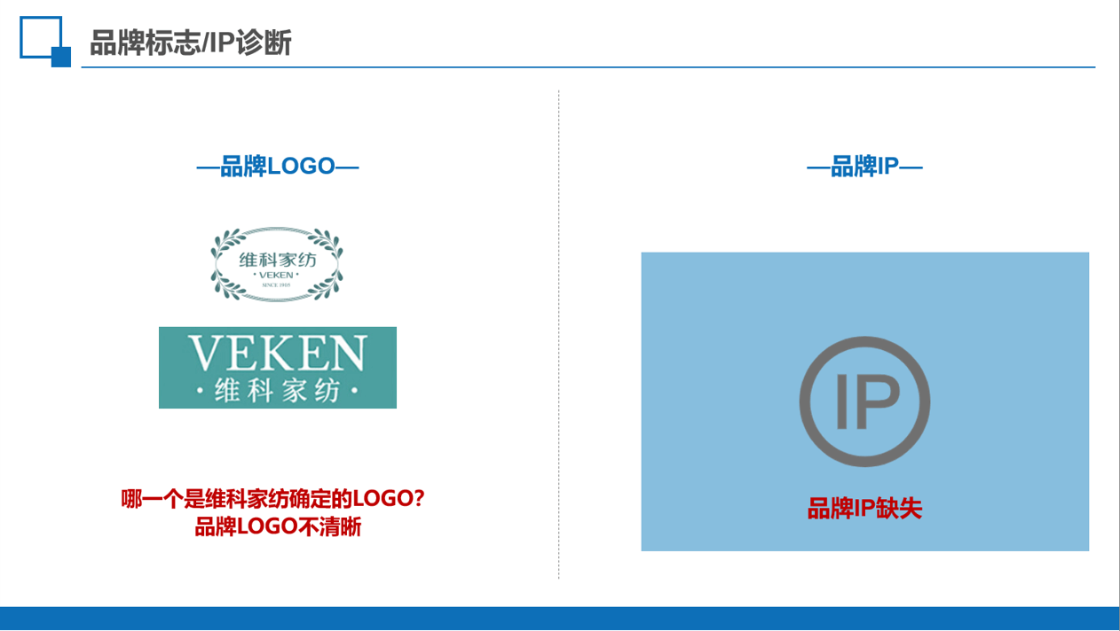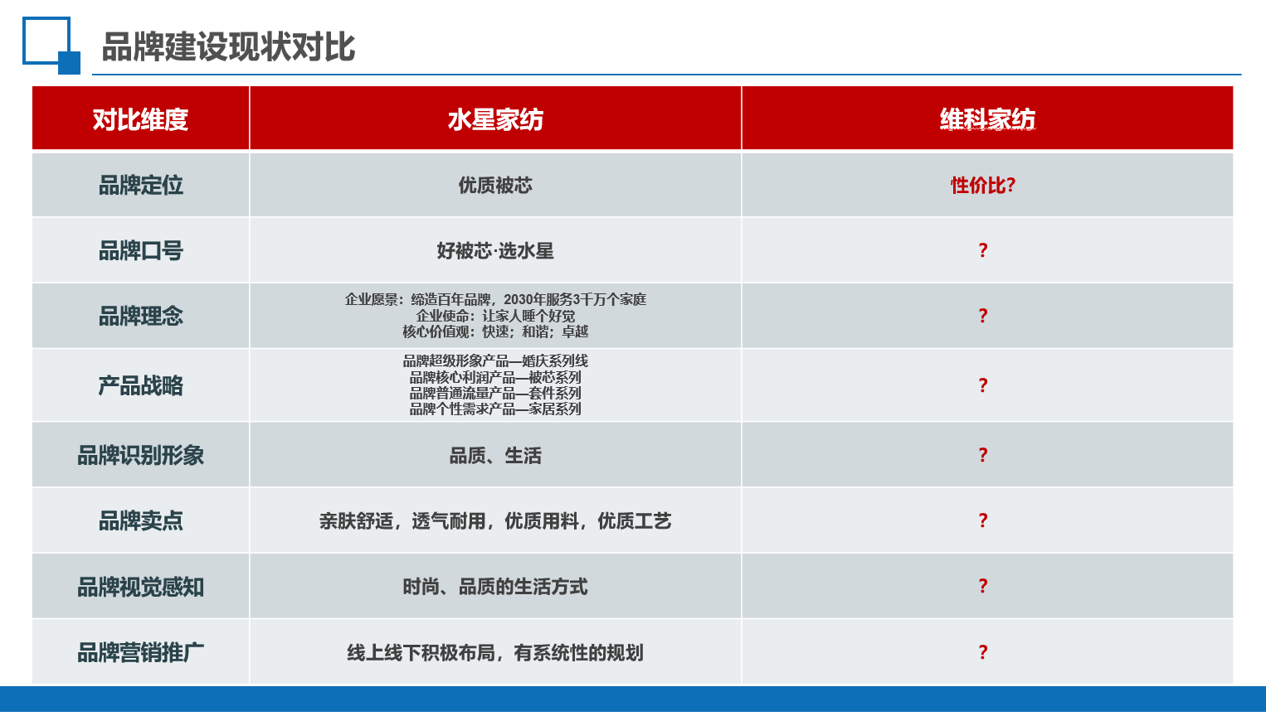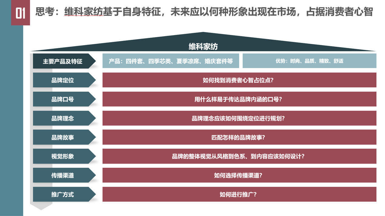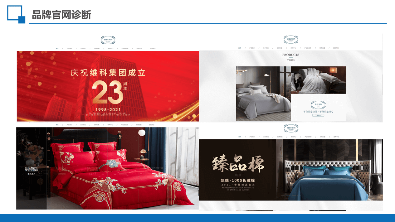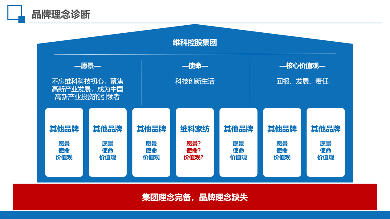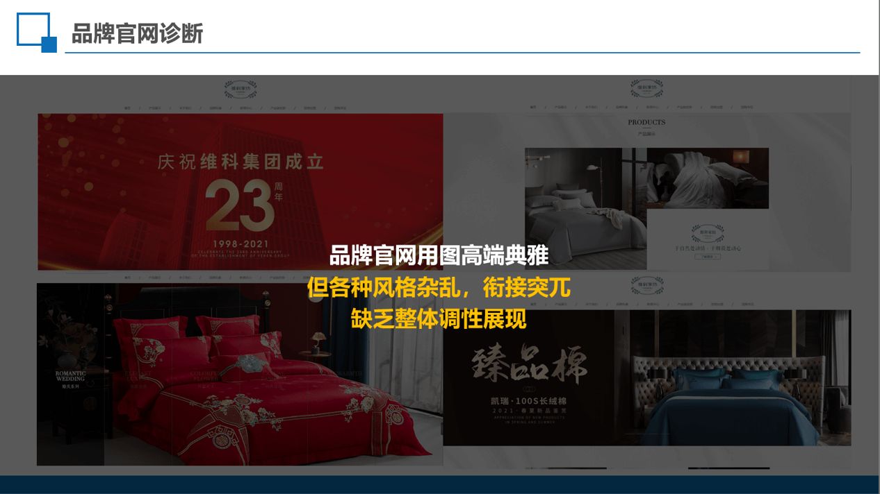 本次找到行舟主要希望借助行舟品牌的力量,帮助维科系统升级品牌形象!在初步了解了维科的需求后,行舟品牌利用独创的大定位工具,开始对维科品牌展开系统诊断。行舟通过维科家纺品牌的信息网站、资料咨讯、线上测评获取的信息,初步判断,维科在品牌战略层面至少存在13大问题: