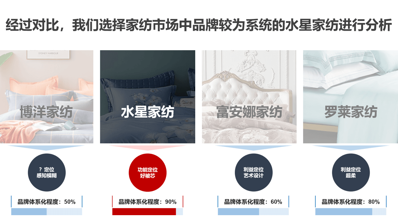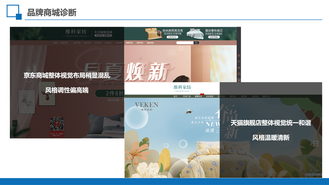 2、品牌定位:维科家纺品牌方认知的定位是“性价比”。但品牌对外露出则强调于各个方向,如“优质本真”、“自然花卉”、“舒适”等,品牌定位模糊,没有形成系统合力;