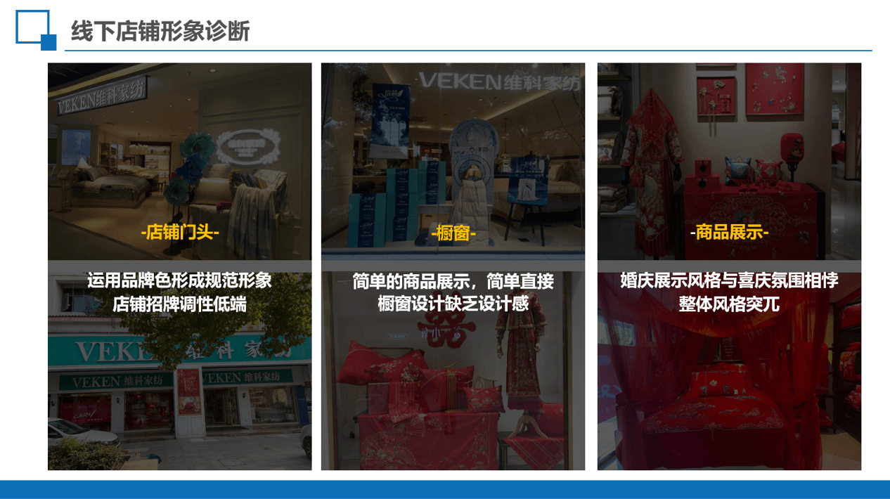 10、线下门店视觉:店铺门头运用品牌色形成规范形象,店铺招牌调性低端;橱窗商品展示,简单直接,但缺乏设计感;婚庆展示风格与喜庆氛围相悖,整体风格突兀;