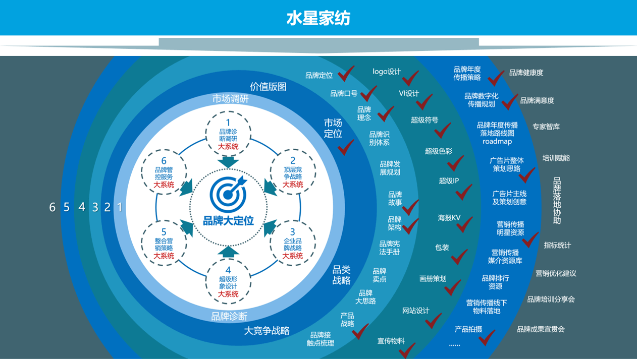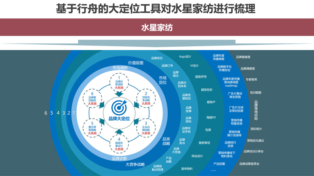 在行舟初步的诊断与对比分析之下,维科家纺高层对品牌存在的诸多问题表示认同,尤其在与竞争对手比较之后,其高层对品牌系统升级的决心更为坚定!维科的情况在行舟品牌看来其实就是如何解决客户优选维科品牌的问题,作业逻辑就是精准定位,围绕定位做好360°的触点布局,实现消费者的心智穿透。用行舟品牌成功心法概括,那就是:一个靶心,系统合力,全面落地!