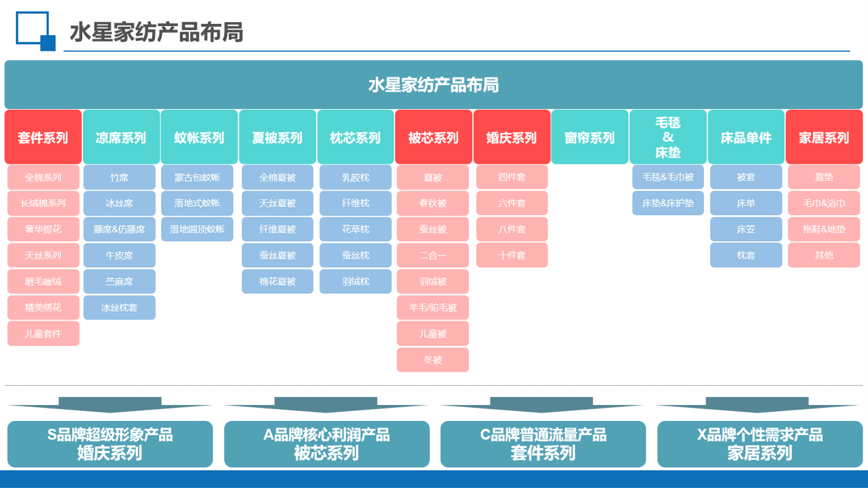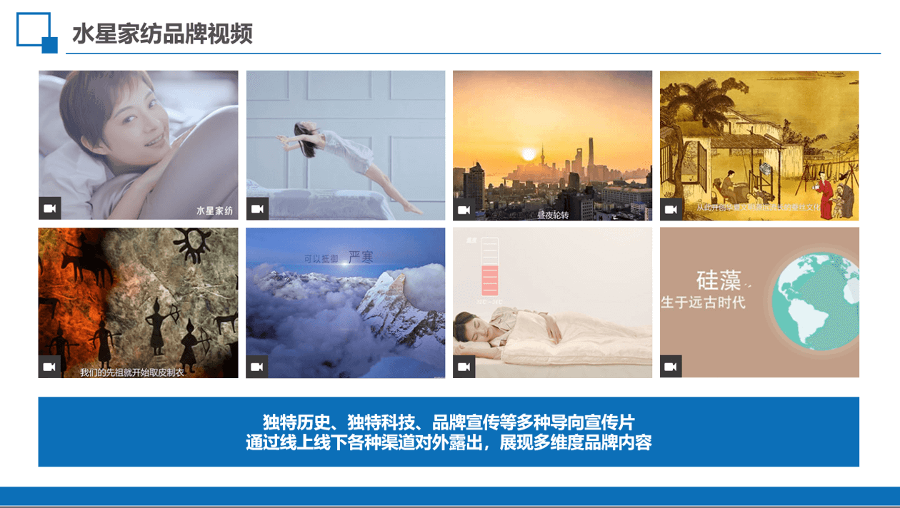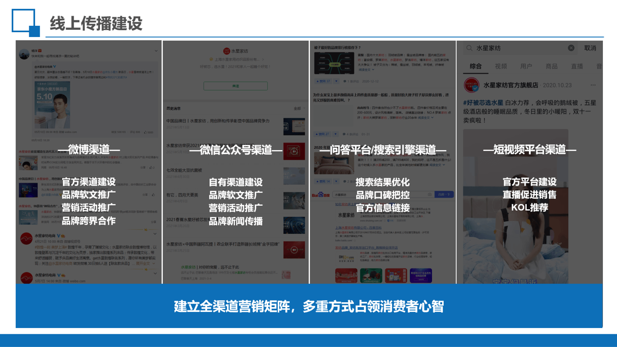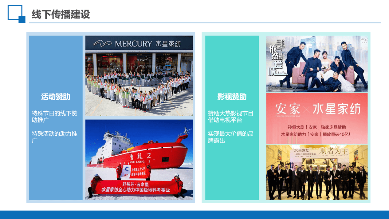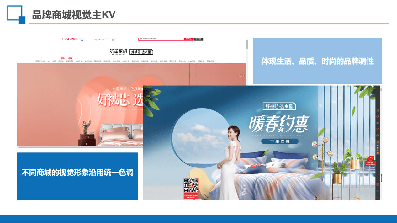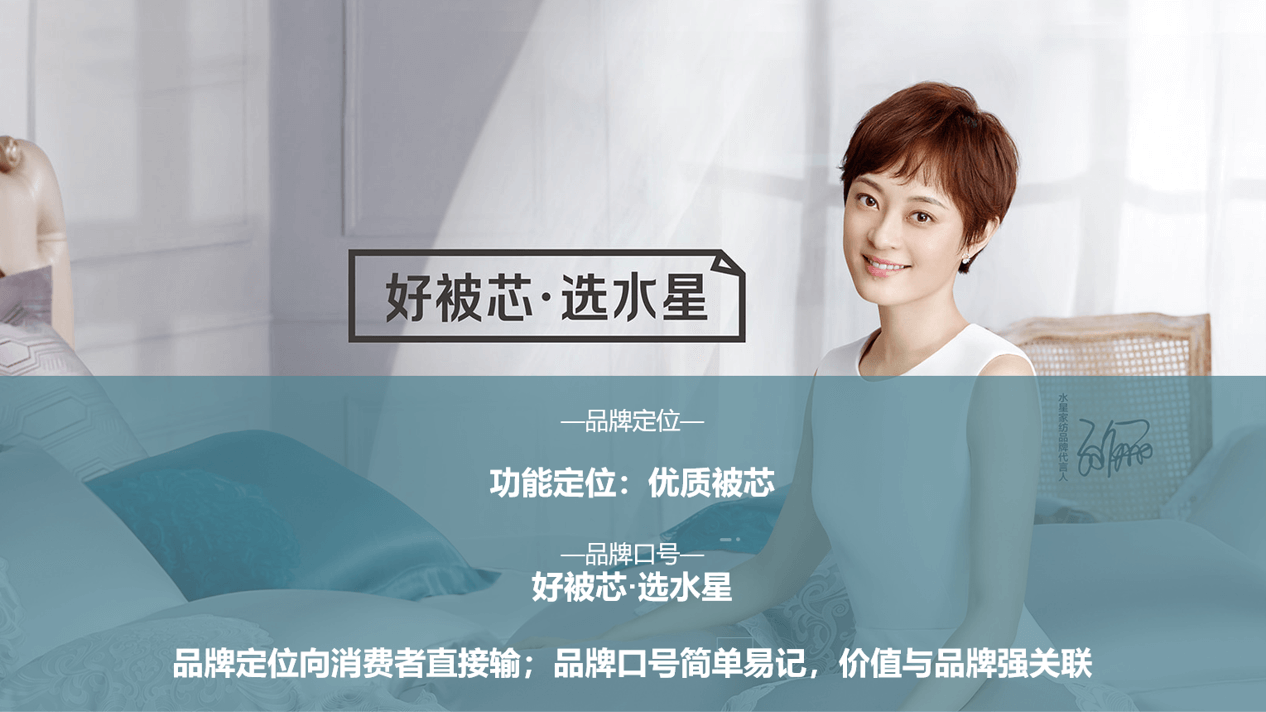 为使维科高层更好的理解品牌体系化的优势,行舟品牌对其相关竞品—水星家纺进行了对比分析。经梳理后,我们发现,水星家纺的品牌定位非常清晰,即“优质被芯”,基于此定位,它的口号也非常精准“好被芯、选水星”。品牌定位通过口号向消费者直接输出,且品牌口号简单易记,从而使价值与品牌强关联。不仅如此,水星各产品的卖点也围绕“优质”的定位展开提炼,即“亲肤舒适”、“透气耐用”、“优质用料”、“优质工艺”。水星家纺在对外宣传的视频中也采用独特历史、独特科技、品牌宣传等多种导向宣传片,通过线上线下各种渠道对外露出,展现多维度品牌内容。包括各类应用的主KV中也在体现生活、品质、时尚的品牌调性,同时将代言人-孙俪,大篇幅露出强调品牌调性,图片精致清晰,色彩冲击强烈,品质感呼之欲出。在营销布局上,水星建立了全渠道营销矩阵,多重方式占领消费者心智,并通过活动赞助、影视赞助等,实现最大价值的露出。