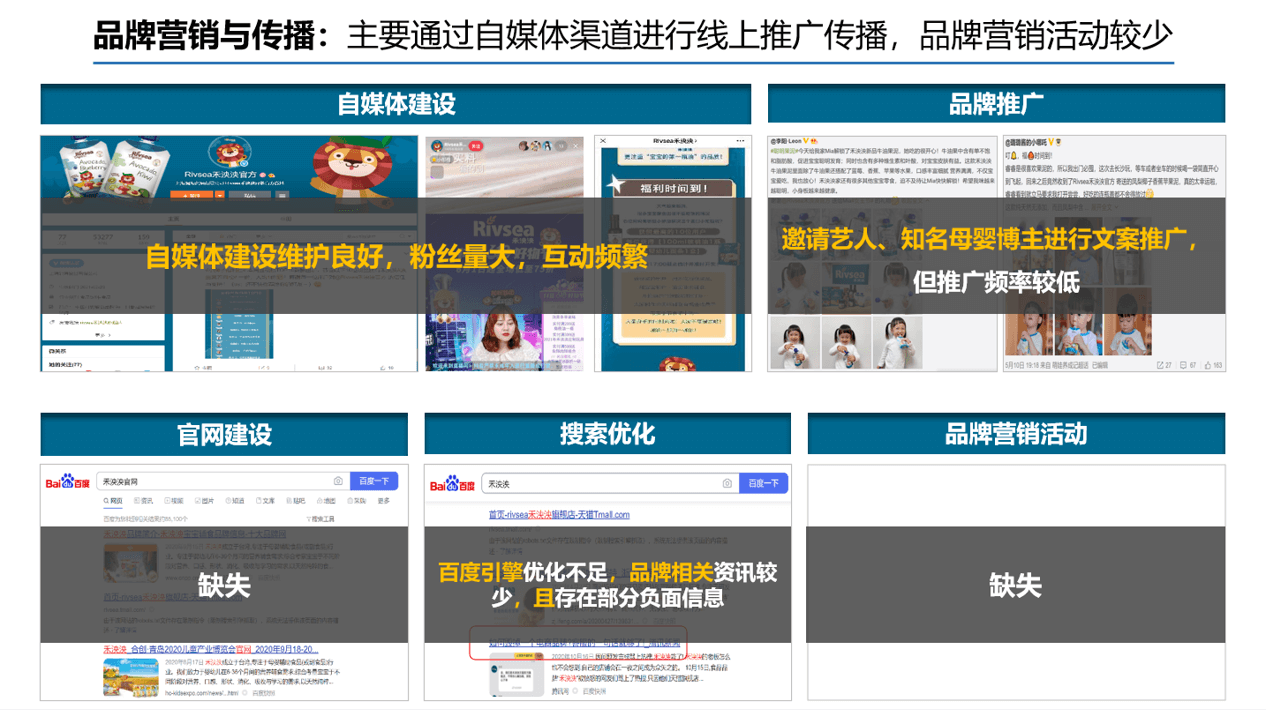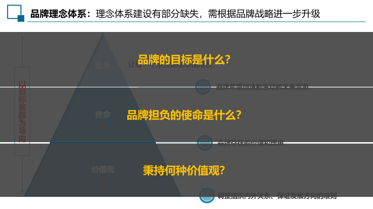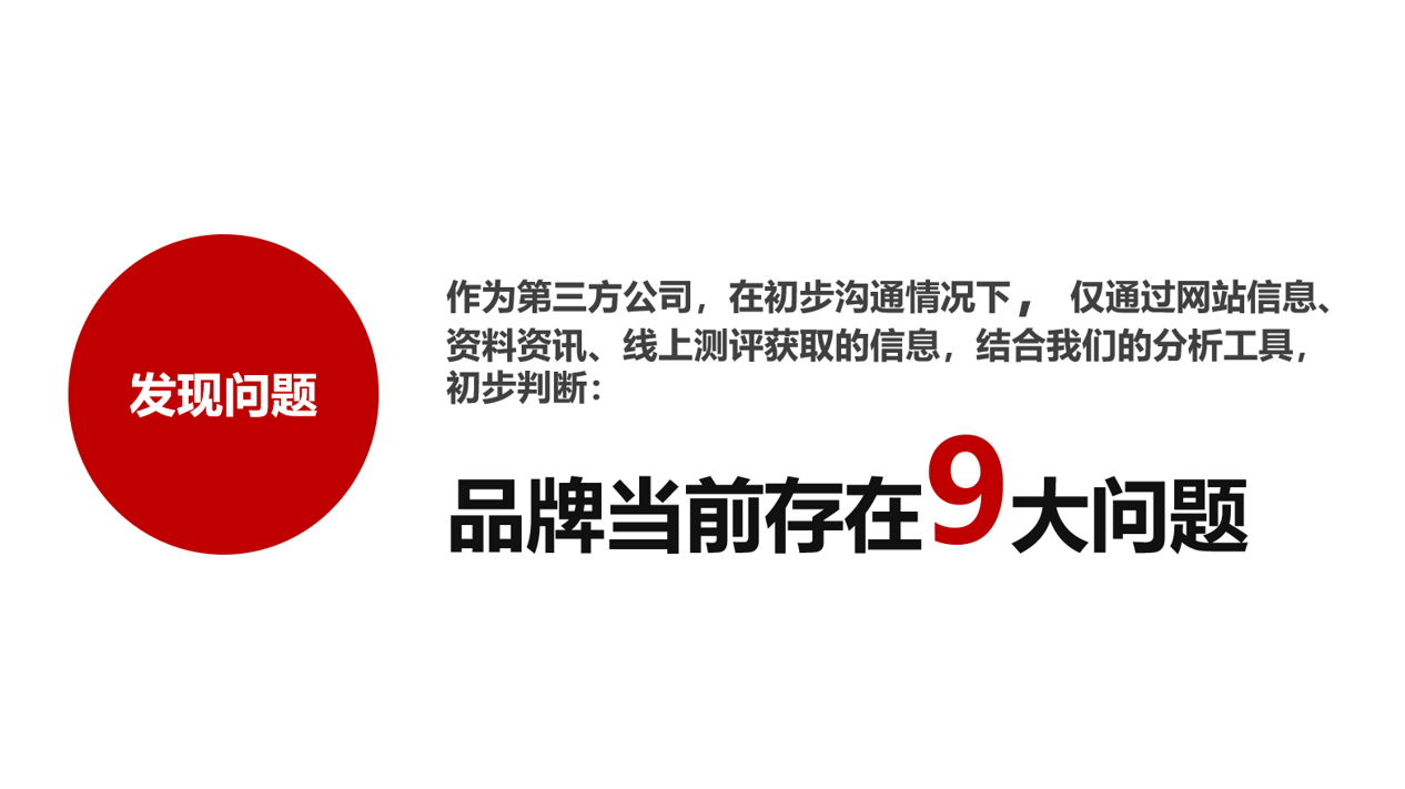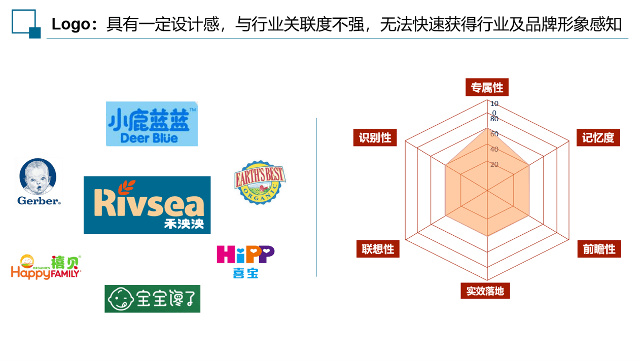 禾泱泱的产品品类较为齐全,覆盖大部分母婴辅食产品,有营养主食,辅助小食,辅助调味品等。目前禾泱泱以每年3倍速度成长扩,2020年度整体业绩增长率达290.6%;全渠道销量平均分布, 线上线下各占50%。禾泱泱销量增速较稳定,但企业高层基于对品牌发展的长远考虑,重视是品牌的全面升级与系统化塑造!在初步了解了裕灌的需求后,行舟品牌利用独创的大定位工具,开始对禾泱泱品牌展开系统诊断。行舟通过禾泱泱品牌的信息网站、资料咨讯、线上测评获取的信息,初步判断,禾泱泱在品牌战略层面至少存在9大问题: