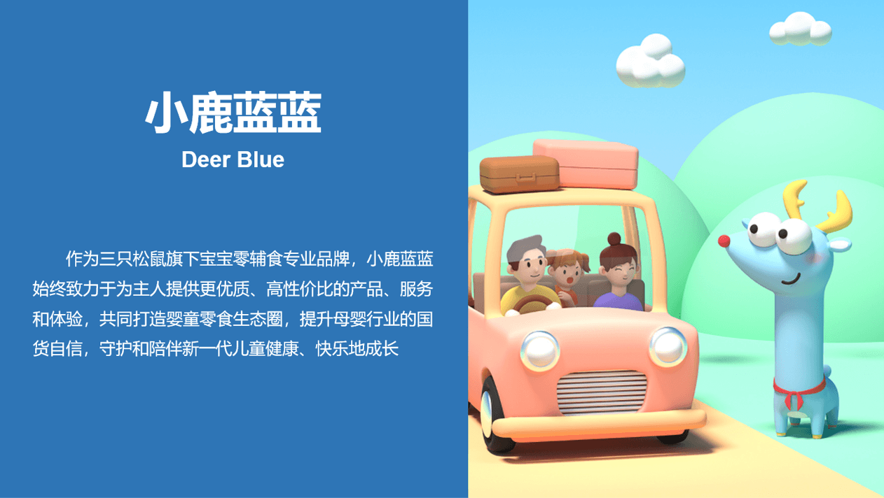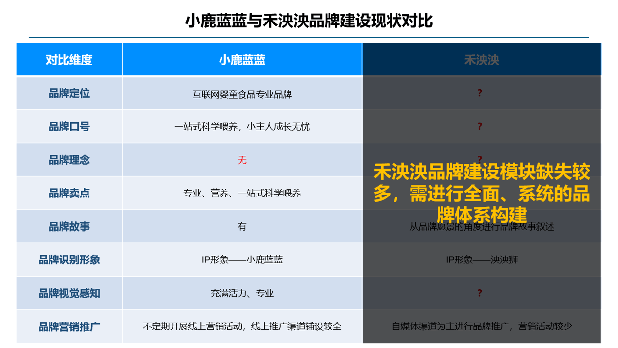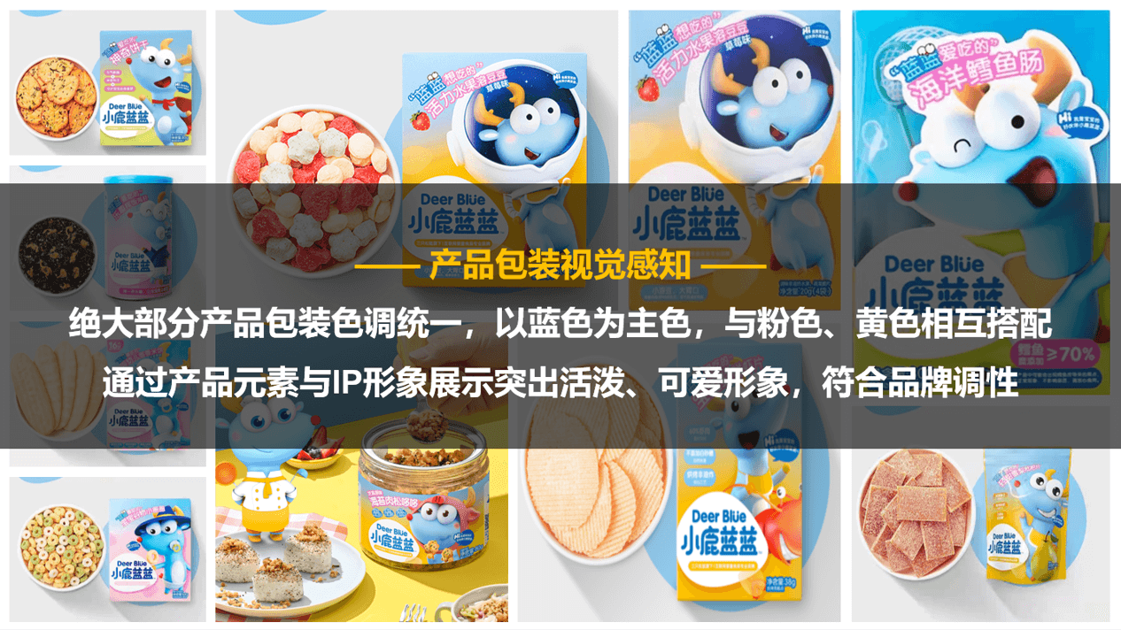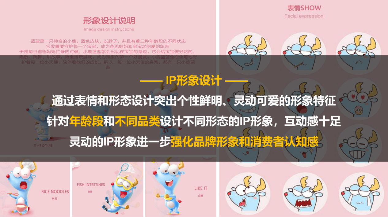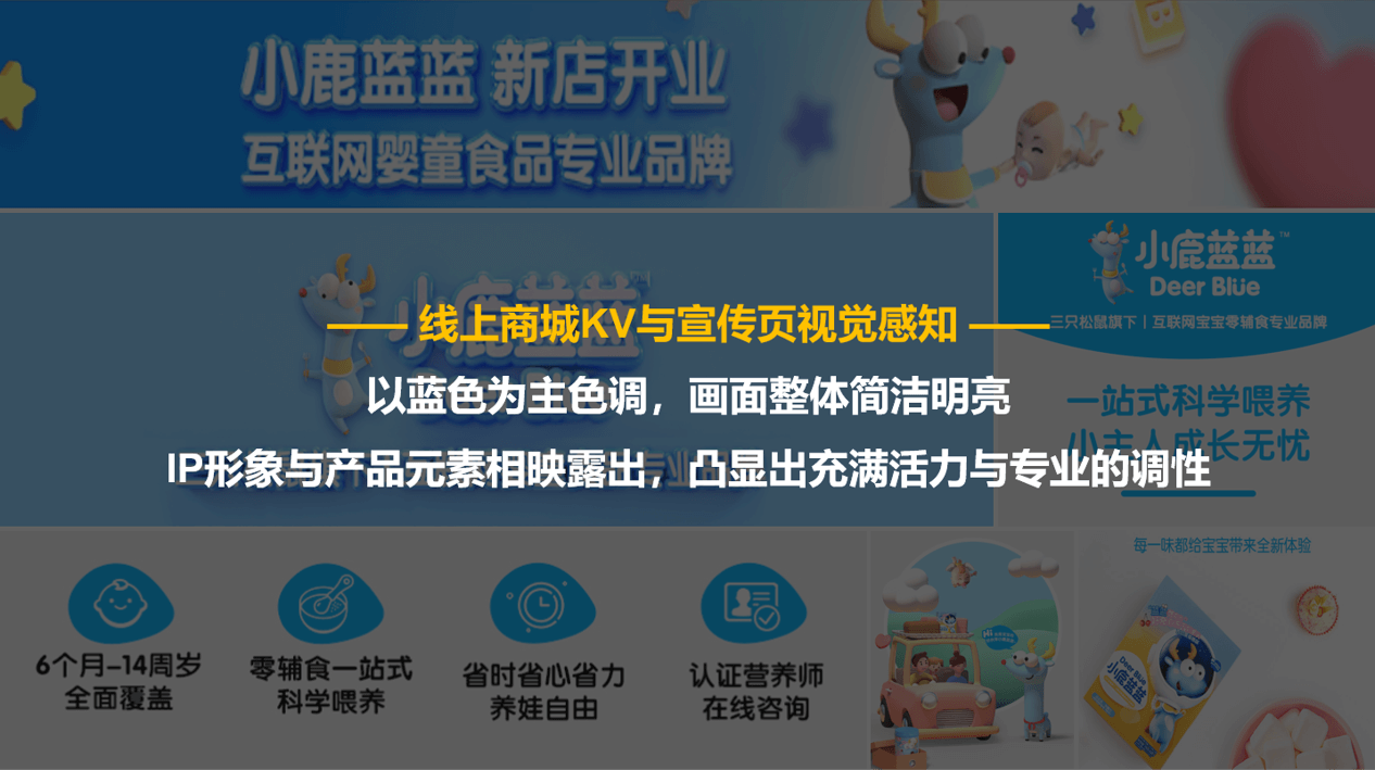 为使禾泱泱高层更好的理解品牌体系化的优势,行舟品牌对其相关竞品—小鹿蓝蓝进行了对比分析。经梳理后,我们发现,小鹿蓝蓝的品牌定位比较清晰,主张“专业”,小鹿蓝蓝各产品的卖点均围绕“专业”的定位展开描述,口号上采用“一站式科学喂养,小主人成长无忧”,也传递出品牌的核心价值主张。除此之外,小鹿蓝蓝的品牌视觉也围绕定位点展开体系化的设计,产品的包装上,绝大部分产品包装色调统一,以蓝色为主色,与粉色、黄色相互搭配,通过产品元素与IP形象展示突出活泼、可爱形象,符合品牌调性。品牌的IP运用到旗舰店、包装、宣传画面等,可爱的小鹿形象深入人心。