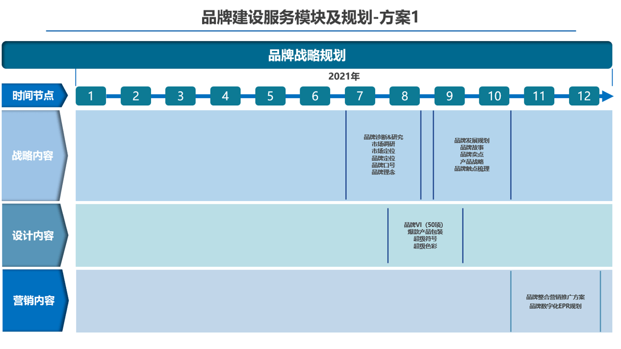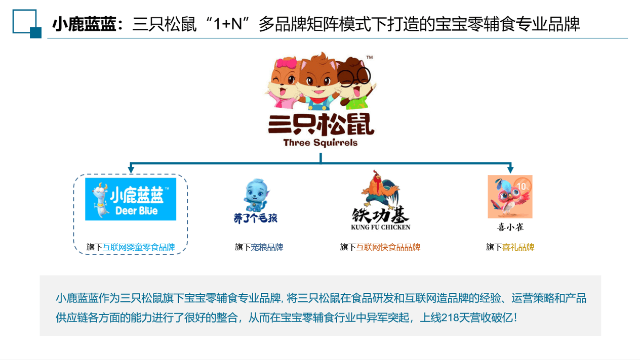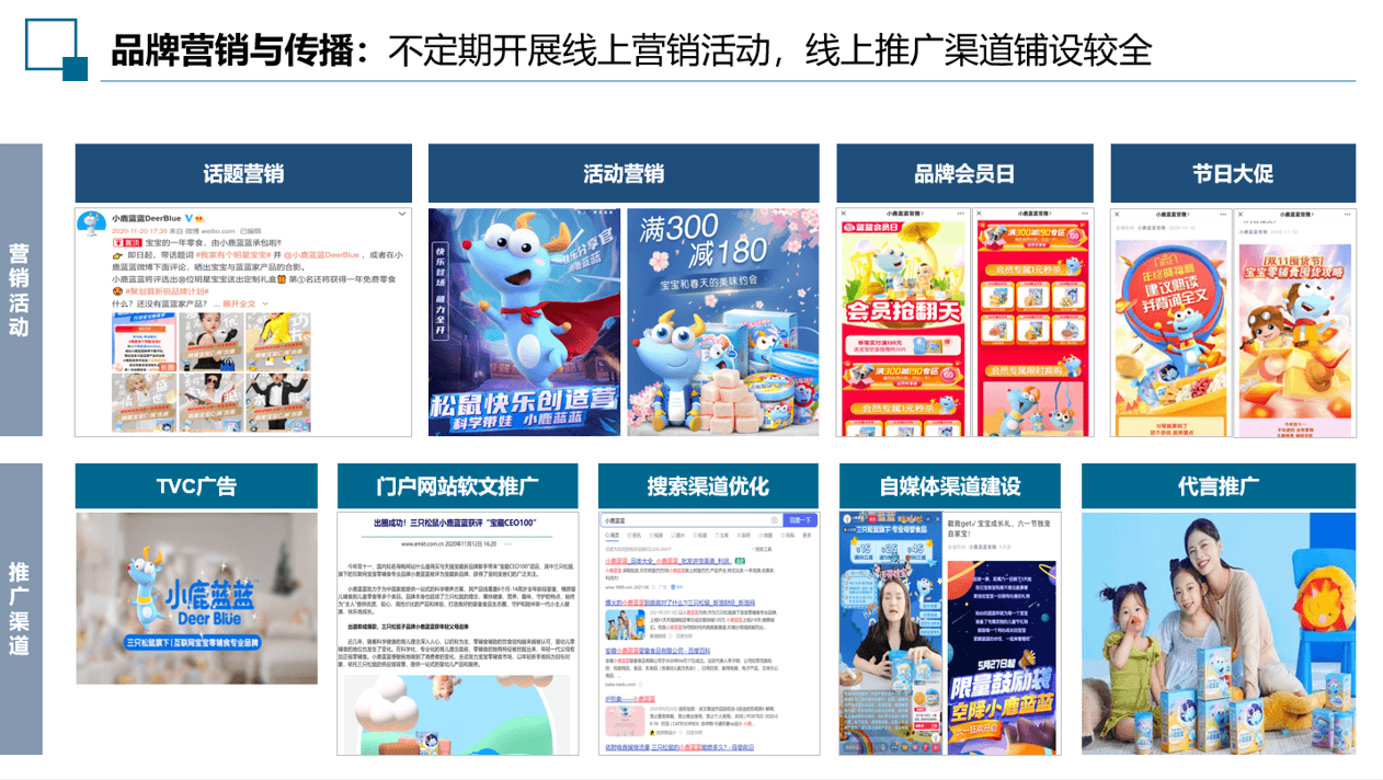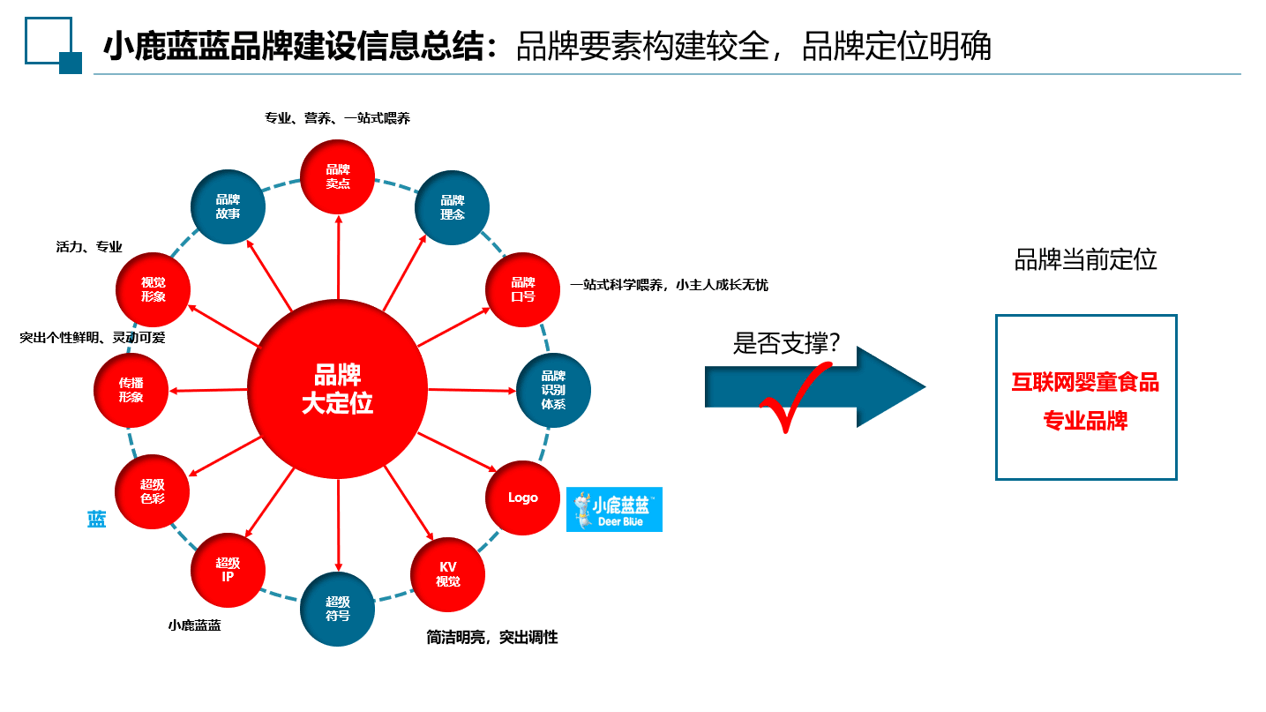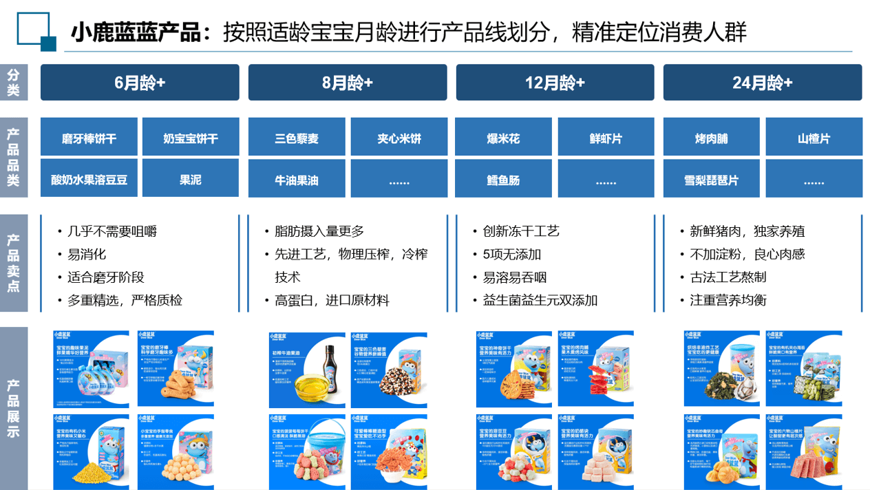 为使禾泱泱高层更好的理解品牌体系化的优势,行舟品牌对其相关竞品—小鹿蓝蓝进行了对比分析。经梳理后,我们发现,小鹿蓝蓝的品牌定位比较清晰,主张“专业”,小鹿蓝蓝各产品的卖点均围绕“专业”的定位展开描述,口号上采用“一站式科学喂养,小主人成长无忧”,也传递出品牌的核心价值主张。除此之外,小鹿蓝蓝的品牌视觉也围绕定位点展开体系化的设计,产品的包装上,绝大部分产品包装色调统一,以蓝色为主色,与粉色、黄色相互搭配,通过产品元素与IP形象展示突出活泼、可爱形象,符合品牌调性。品牌的IP运用到旗舰店、包装、宣传画面等,可爱的小鹿形象深入人心。
