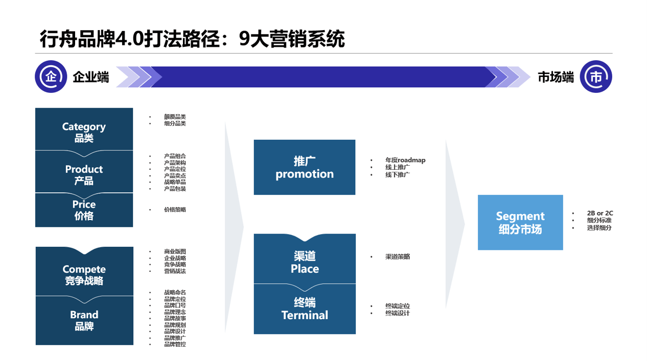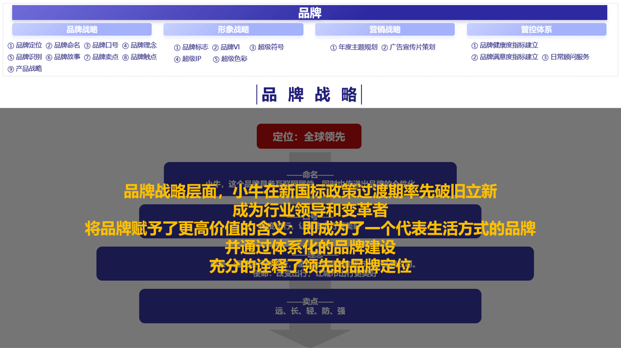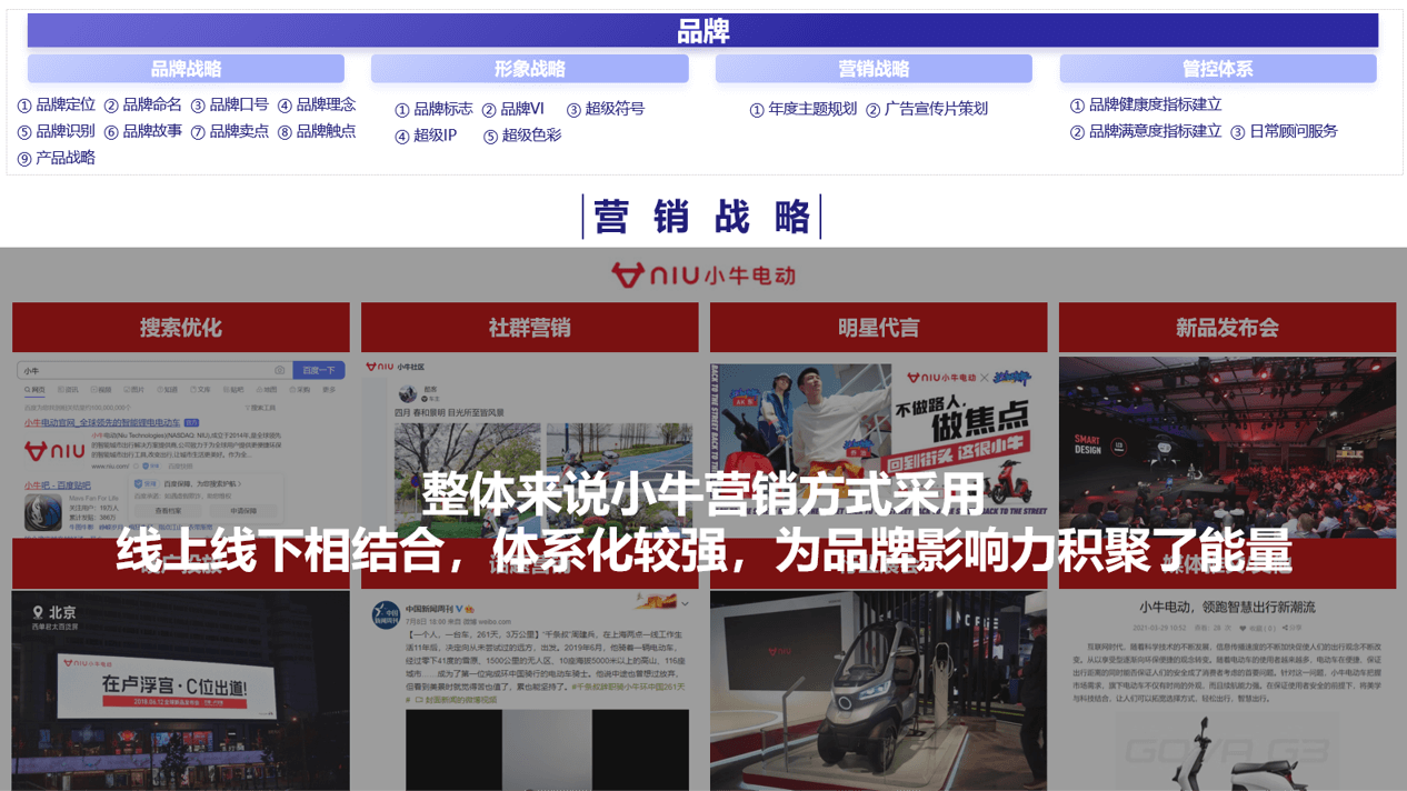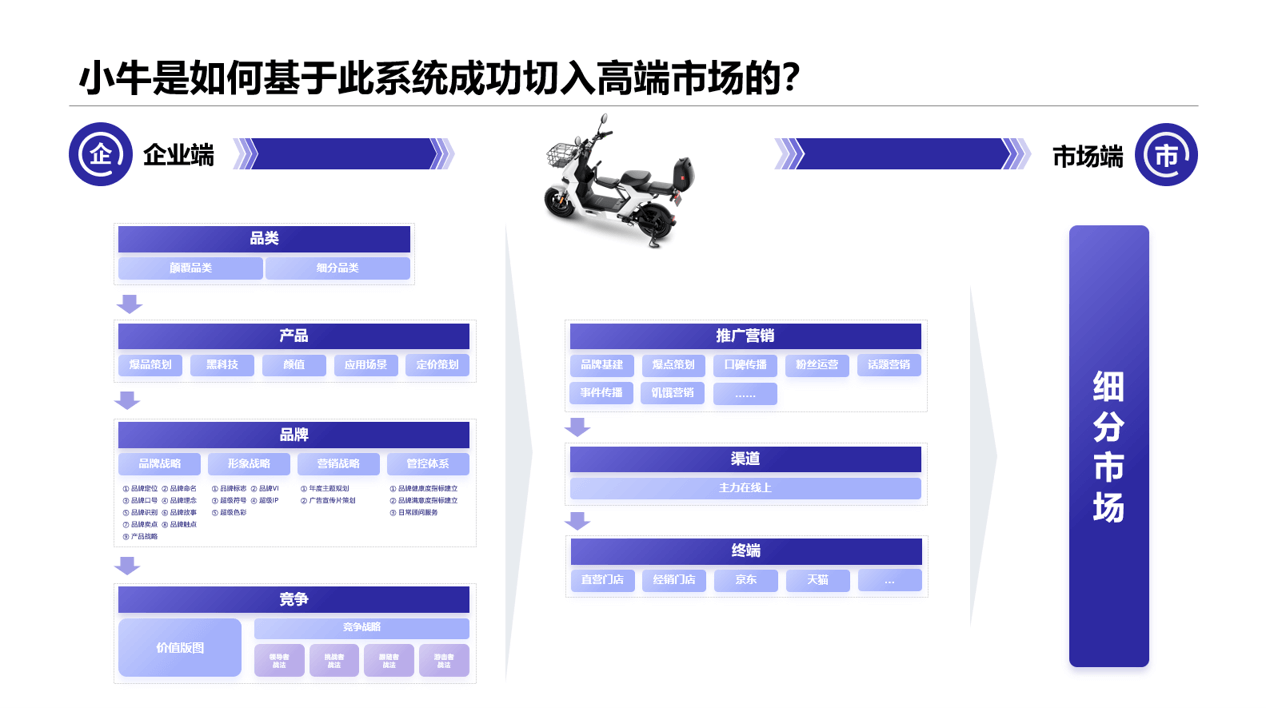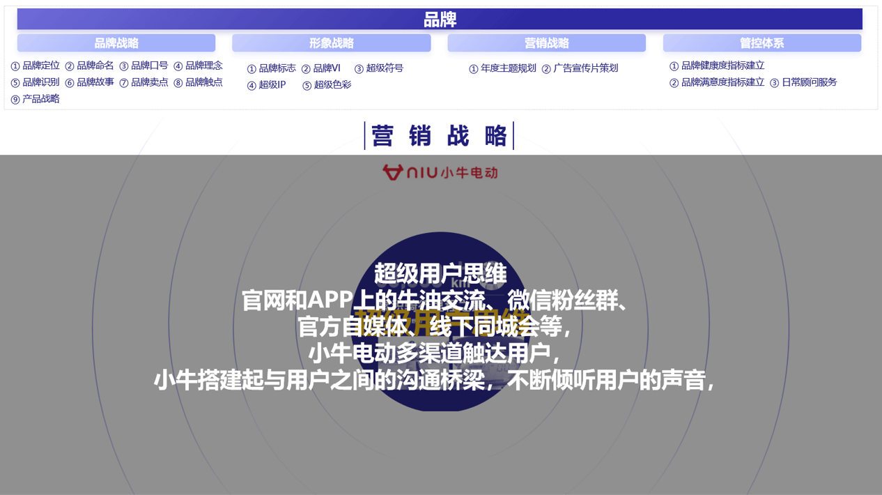 大金一直以来在商用空调机市场处于龙头地位,目前,大金希望通过互联网新销售模式,及高溢价的产品和服务,在家用分体机市场获得一定市场份额,最终实现销售增长。因此找到行舟品牌咨询,希望借助第三方的力量助力大金找到未来的方向。在与大金品牌进行了两轮沟通后,行舟团队马上对大金的新需求展开讨论并撰写了思考建议方案。行舟认为,大金想要重新在家用分体机市场占据一席之地,行舟的4.0打法之一,营销9系统,或许可以为大金提供较好的方法依据。为了使大金更好的理解此方法论,行舟借用互联网电动车品牌小牛进行拆解分析,全面的诠释了何为9大营销系统,为什么9大营销系统可以帮助企业制胜。