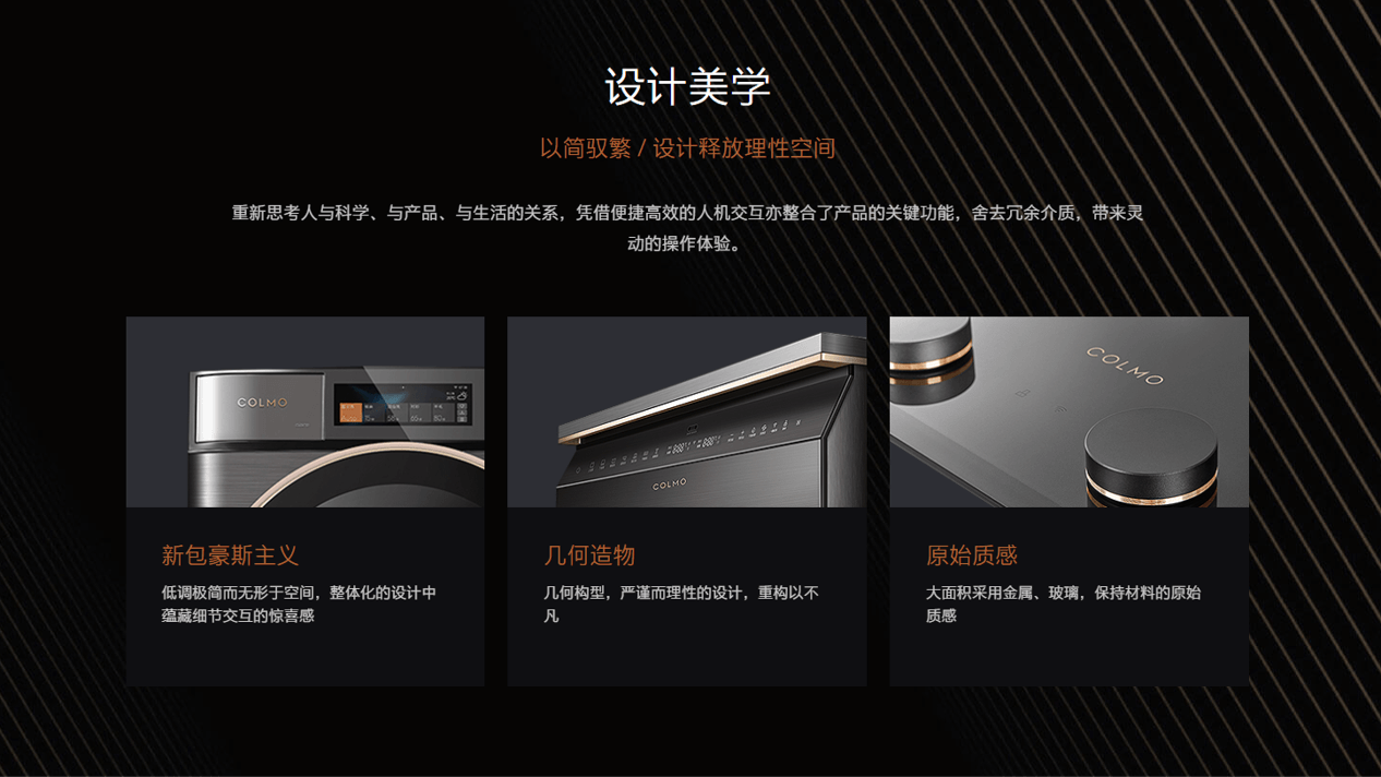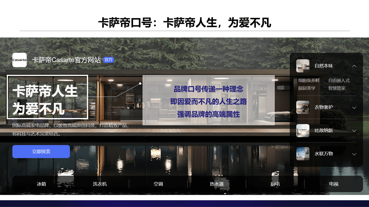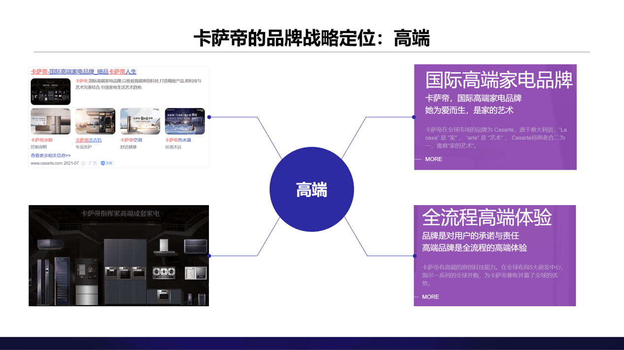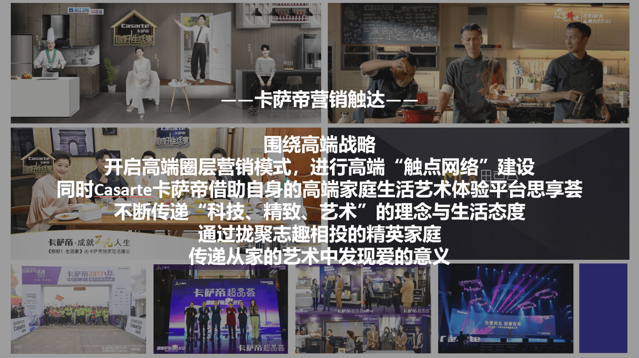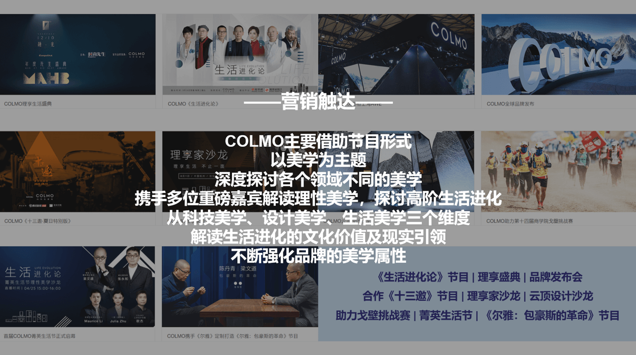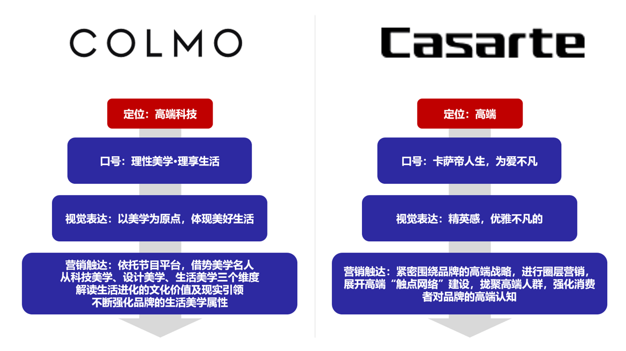 经过梳理分析,我们发现,美的COLMO从高端科技切入,倡导“理性美学·理享生活“,各类视觉触点与营销落脚点均围绕着”美学“二字展开,并重点依托节目平台,借势美学名人,从科技美学、设计美学、生活美学三个维度,解读生活进化的文化价值及现实引领,不断强化品牌的生活美学属性。而卡萨帝则始终围绕高端战略,主张“卡萨帝人生,为爱不凡”,各类视觉表达上都在体现一种精英感与优雅不凡,营销中心则紧密围绕品牌的高端战略,进行圈层营销,展开高端“触点网络”建设,拢聚高端人群,强化消费者对品牌的高端认知。