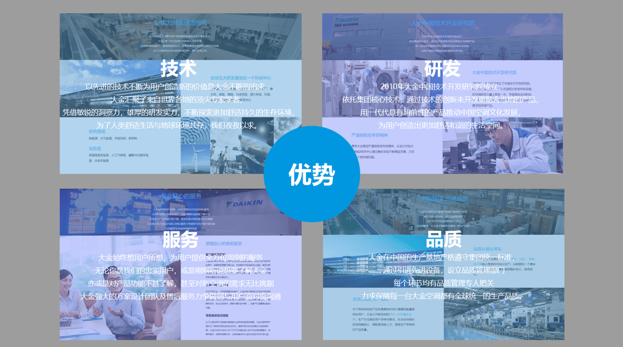 大金自1924年创业以来,已发展成为跨空调、氟化学、油压机械等多个领域的综合型制造企业。在全球拥有270家子公司和生产基地,产品远销150多个国家及地区。自1995年全面开展中国事业以来,大金迅速建立起了从研发、生产、销售到售后服务的一体化完整产业链。以优质的产品及完善的服务赢得了消费者的信赖与关注。大金制造的空调不仅仅是一个商品,空调中的每一个部件在设计师的眼中就像一件件的艺术品。为了给人类带来更好空气品质,大金始终致力于探索人与空气之间舒适的奥秘。