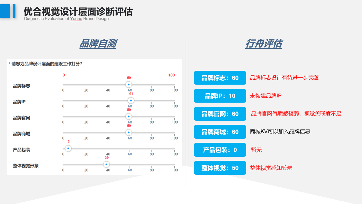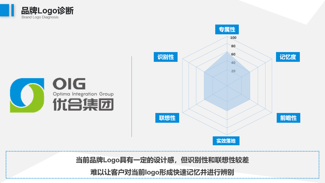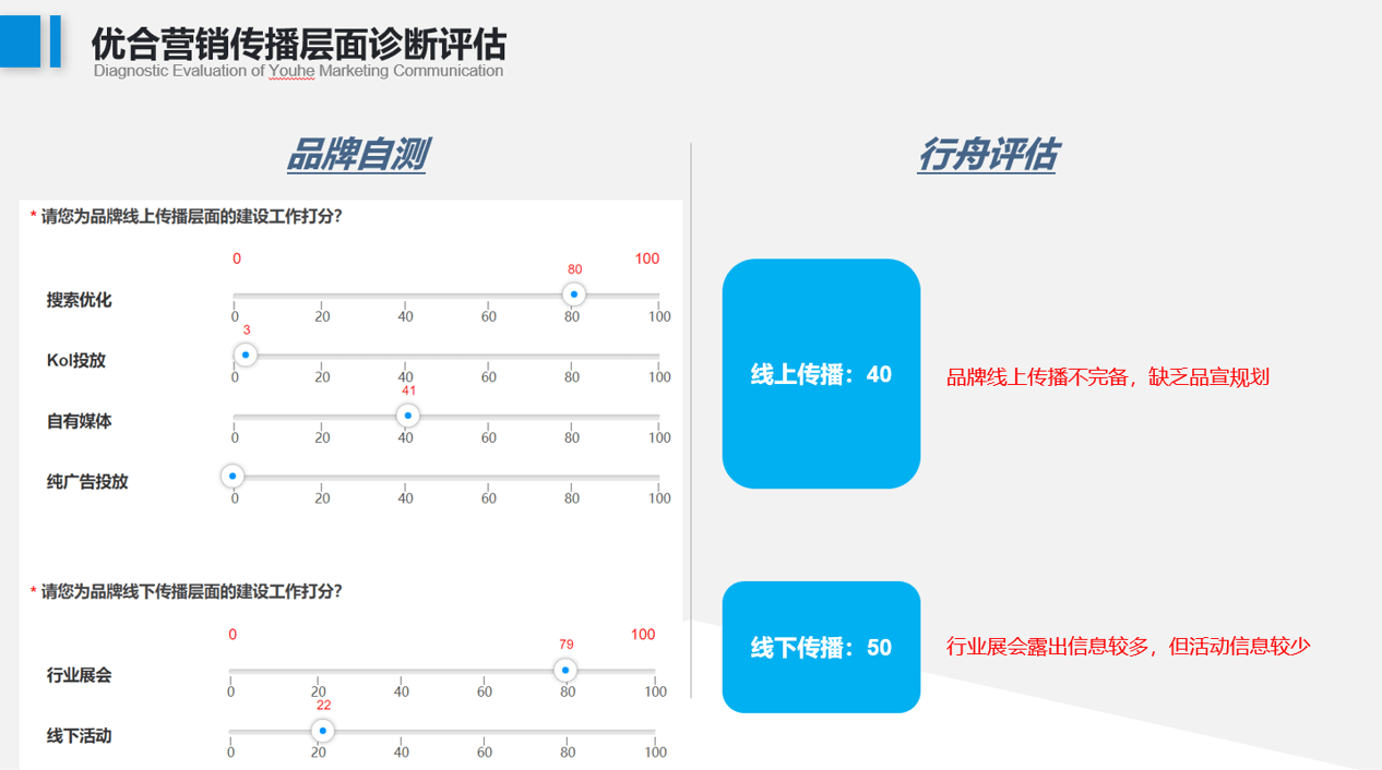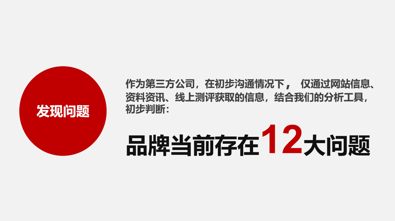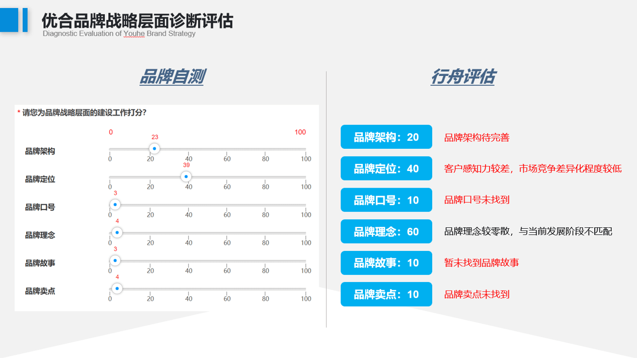 在初步了解过优合的需求后,行舟品牌利用独创的大定位工具,开始对优合集团品牌展开系统诊断。行舟通过优合品牌的信息网站、资料咨讯、线上测评获取的信息,初步判断,优合在品牌战略层面至少存在12大问题: