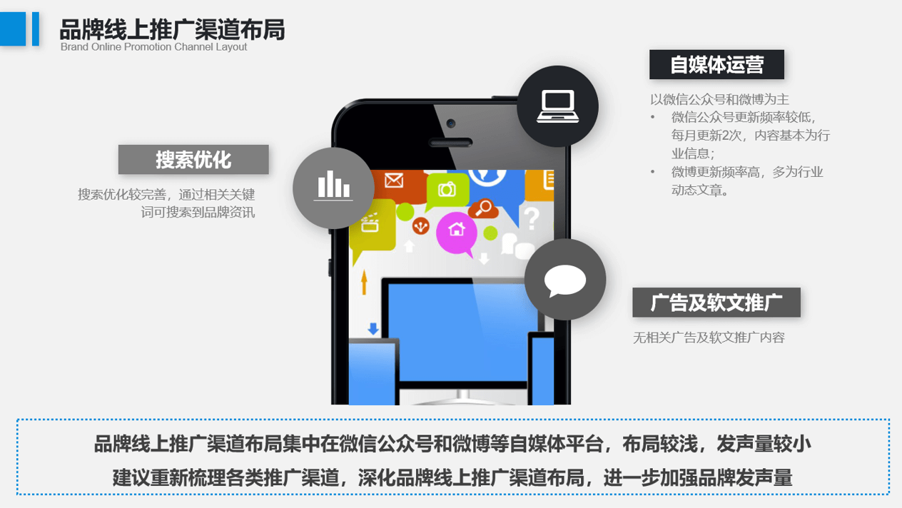 11、品牌线上推广渠道布局集中在微信公众号和微博等自媒体平台,布局较浅,发声量较小;